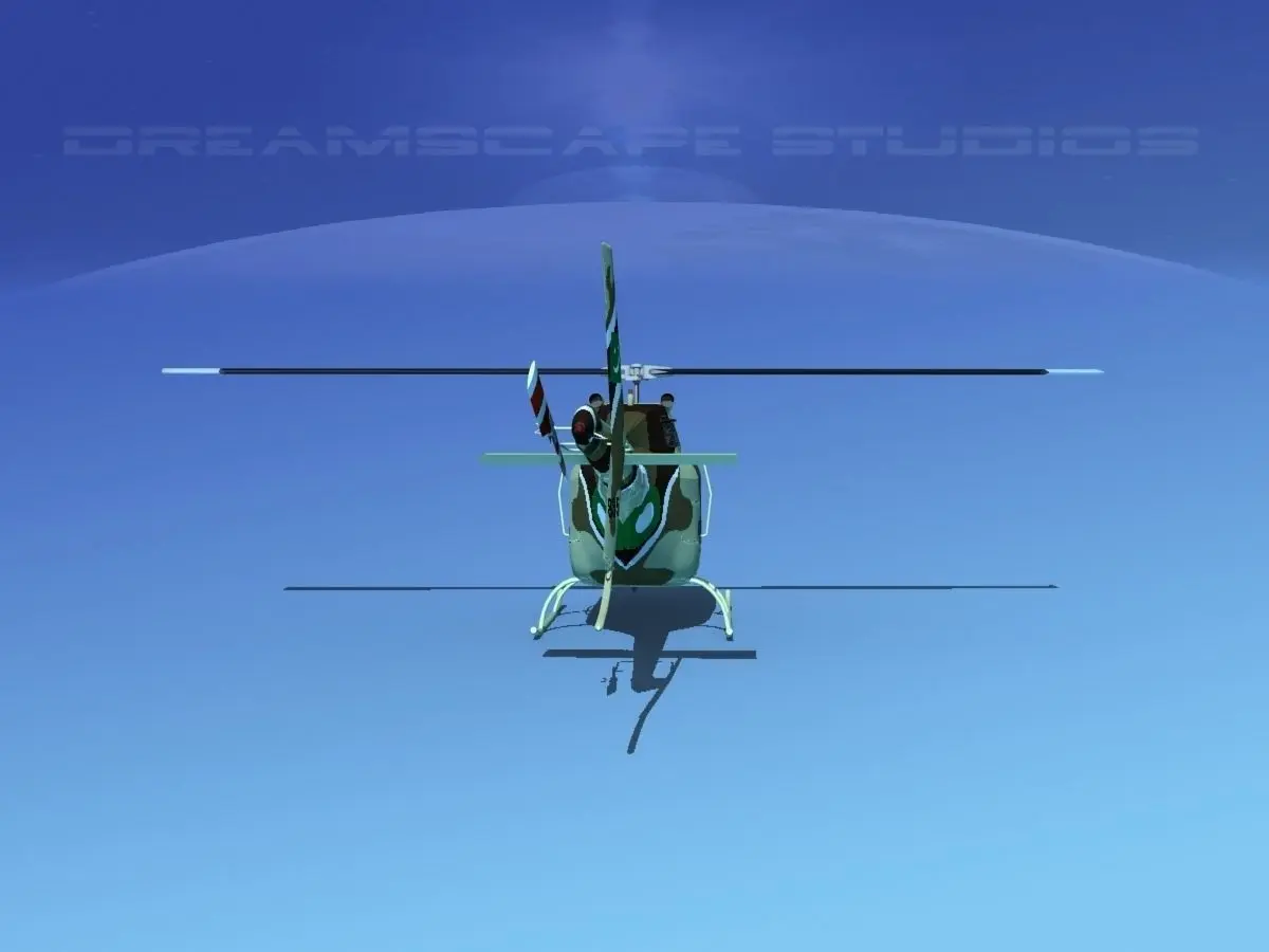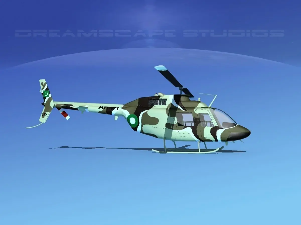 Bell OH-58B Pakistan Army This model was originally built in Max 13 near to scale (within 3-4% of scale) and fully textured. It comes with all the materials and textures shown in renderings here. It is available in several formats for a wide variety of end users. This model comes with many different liveries. It is built to be used in in-flight or airport ground animations and video or simulation. It can also be used to populate an airport scene. The model has animated rotor and tail-rotor. The cockpit is semi detailed including control yoke, cyclic, rudder pedals, seating and instrument panel and armored seat panels.