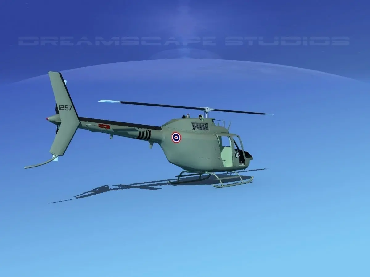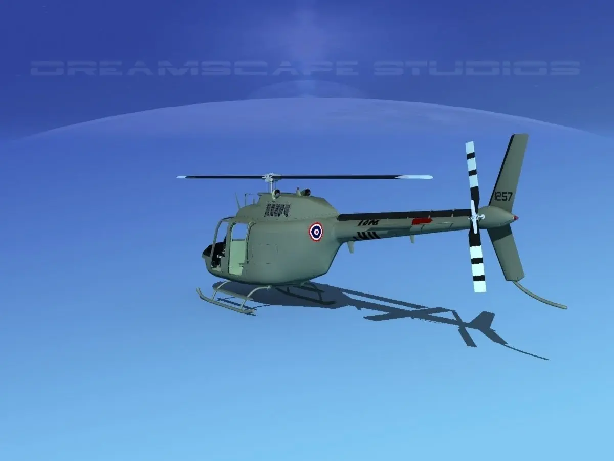 Bell OH-58B Royal Thai Army This model was originally built in Max 13 near to scale (within 3-4% of scale) and fully textured. It comes with all the materials and textures shown in renderings here. It is available in several formats for a wide variety of end users. This model comes with many different liveries. It is built to be used in in-flight or airport ground animations and video or simulation. It can also be used to populate an airport scene. The model has animated rotor and tail-rotor. The cockpit is semi detailed including control yoke, cyclic, rudder pedals, seating and instrument panel and armored seat panels.