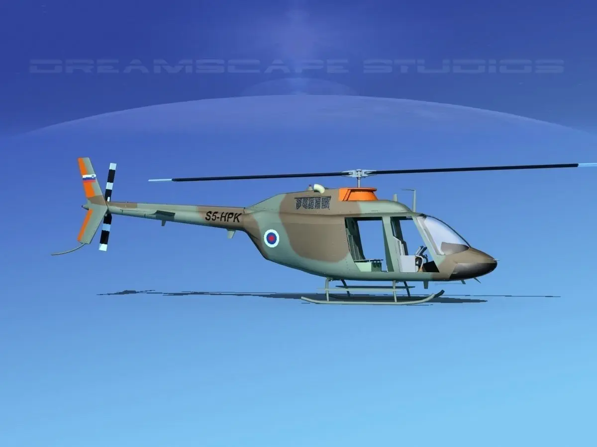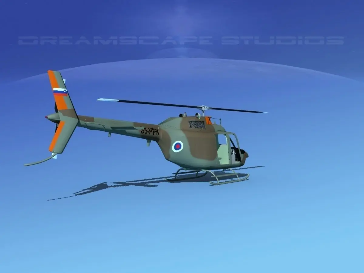 Bell OH-58B Slovenia This model was originally built in Max 13 near to scale (within 3-4% of scale) and fully textured. It comes with all the materials and textures shown in renderings here. It is available in several formats for a wide variety of end users. This model comes with many different liveries. It is built to be used in in-flight or airport ground animations and video or simulation. It can also be used to populate an airport scene. The model has animated rotor and tail-rotor. The cockpit is semi detailed including control yoke, cyclic, rudder pedals, seating and instrument panel and armored seat panels.