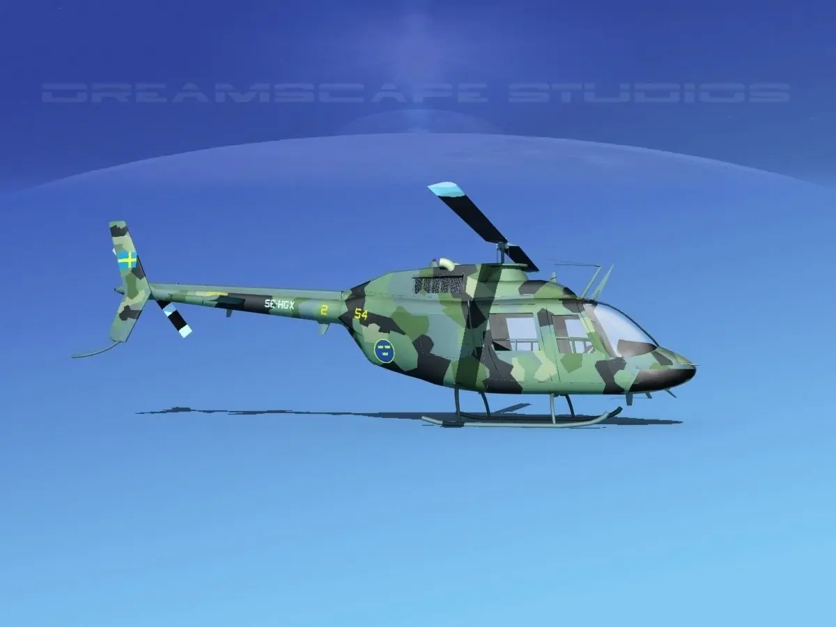 Bell OH-58B Sweedish Army This model was originally built in Max 13 near to scale (within 3-4% of scale) and fully textured. It comes with all the materials and textures shown in renderings here. It is available in several formats for a wide variety of end users. This model comes with many different liveries. It is built to be used in in-flight or airport ground animations and video or simulation. It can also be used to populate an airport scene. The model has animated rotor and tail-rotor. The cockpit is semi detailed including control yoke, cyclic, rudder pedals, seating and instrument panel and armored seat panels.