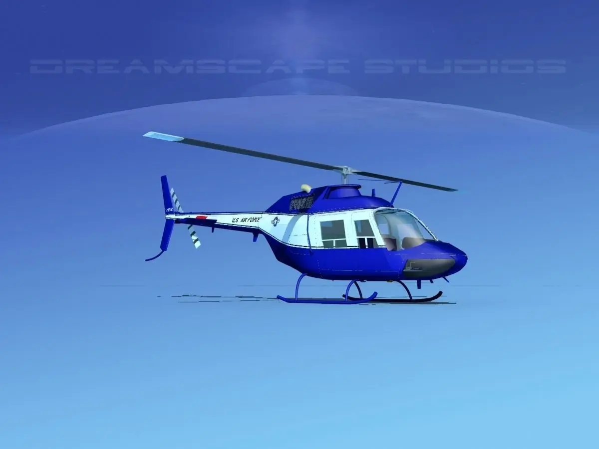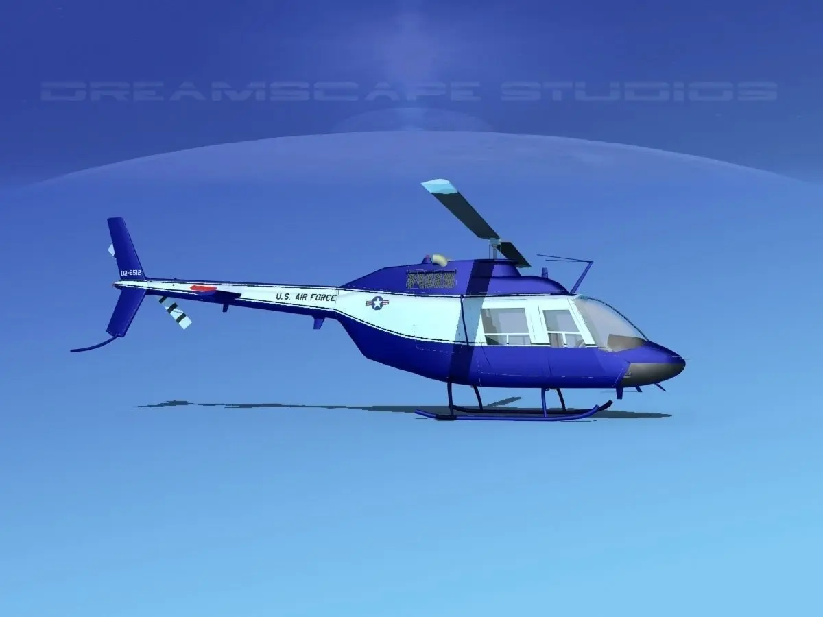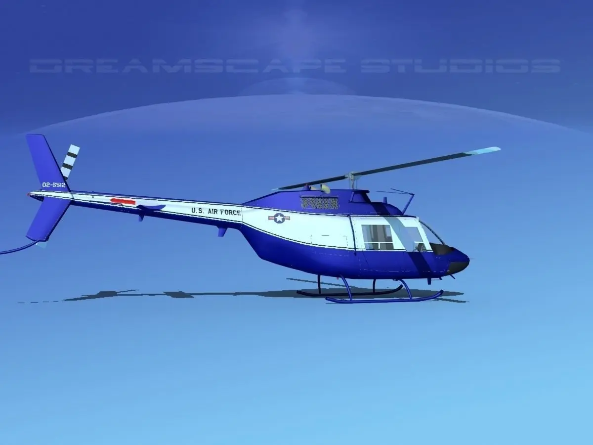 Bell OH-58B US Air Force This model was originally built in Max 13 near to scale (within 3-4% of scale) and fully textured. It comes with all the materials and textures shown in renderings here. It is available in several formats for a wide variety of end users. This model comes with many different liveries. It is built to be used in in-flight or airport ground animations and video or simulation. It can also be used to populate an airport scene. The model has animated rotor and tail-rotor. The cockpit is semi detailed including control yoke, cyclic, rudder pedals, seating and instrument panel and armored seat panels.