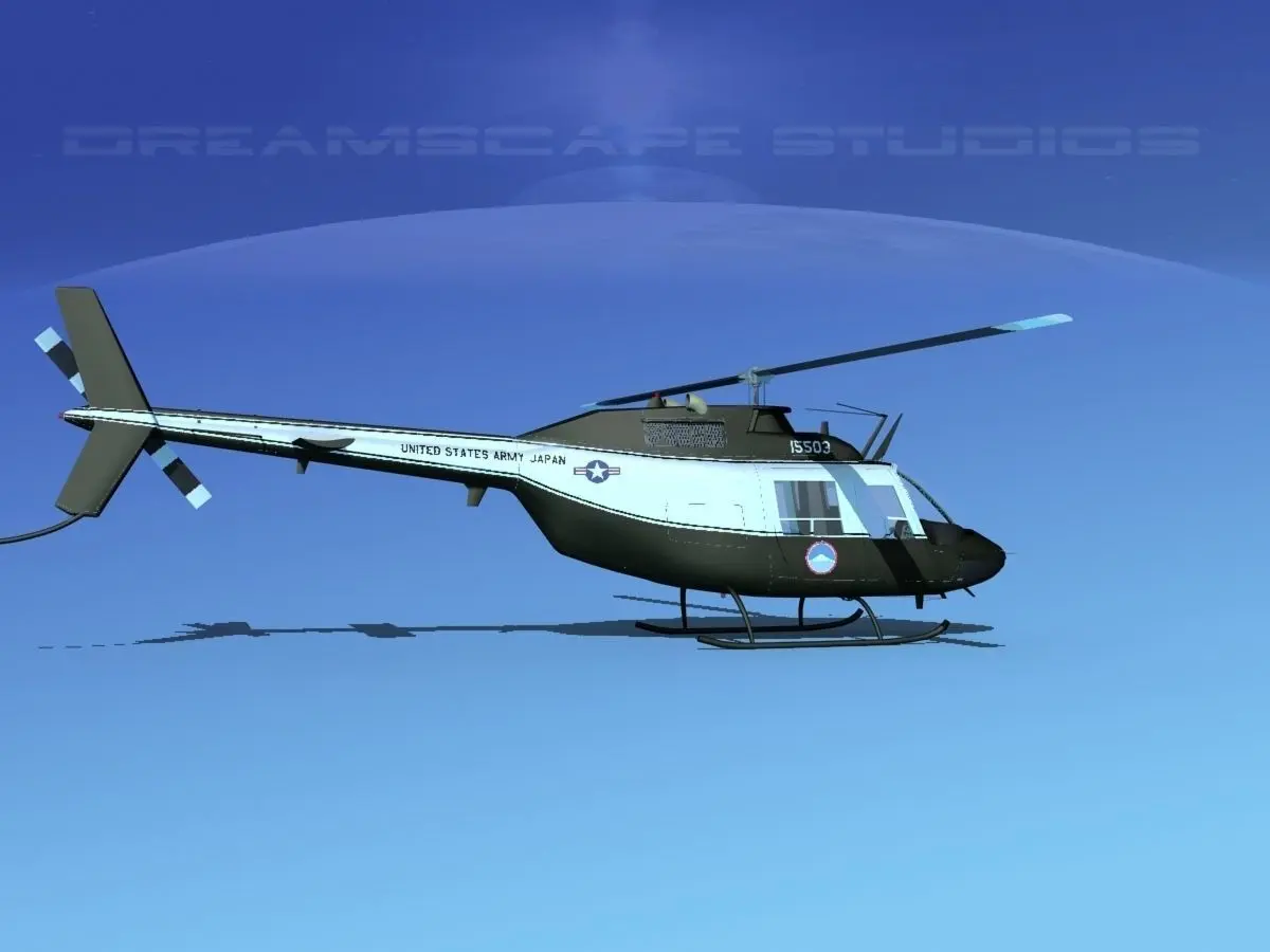 Bell OH-58B US Army Japan This model was originally built in Max 13 near to scale (within 3-4% of scale) and fully textured. It comes with all the materials and textures shown in renderings here. It is available in several formats for a wide variety of end users. This model comes with many different liveries. It is built to be used in in-flight or airport ground animations and video or simulation. It can also be used to populate an airport scene. The model has animated rotor and tail-rotor. The cockpit is semi detailed including control yoke, cyclic, rudder pedals, seating and instrument panel and armored seat panels.