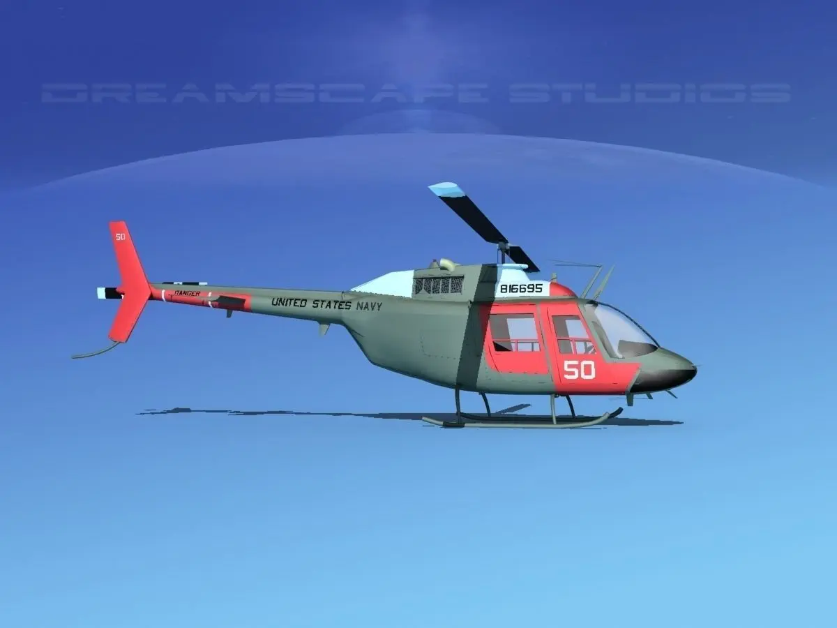 Bell OH-58B US Navy 2 This model was originally built in Max 13 near to scale (within 3-4% of scale) and fully textured. It comes with all the materials and textures shown in renderings here. It is available in several formats for a wide variety of end users. This model comes with many different liveries. It is built to be used in in-flight or airport ground animations and video or simulation. It can also be used to populate an airport scene. The model has animated rotor and tail-rotor. The cockpit is semi detailed including control yoke, cyclic, rudder pedals, seating and instrument panel and armored seat panels.