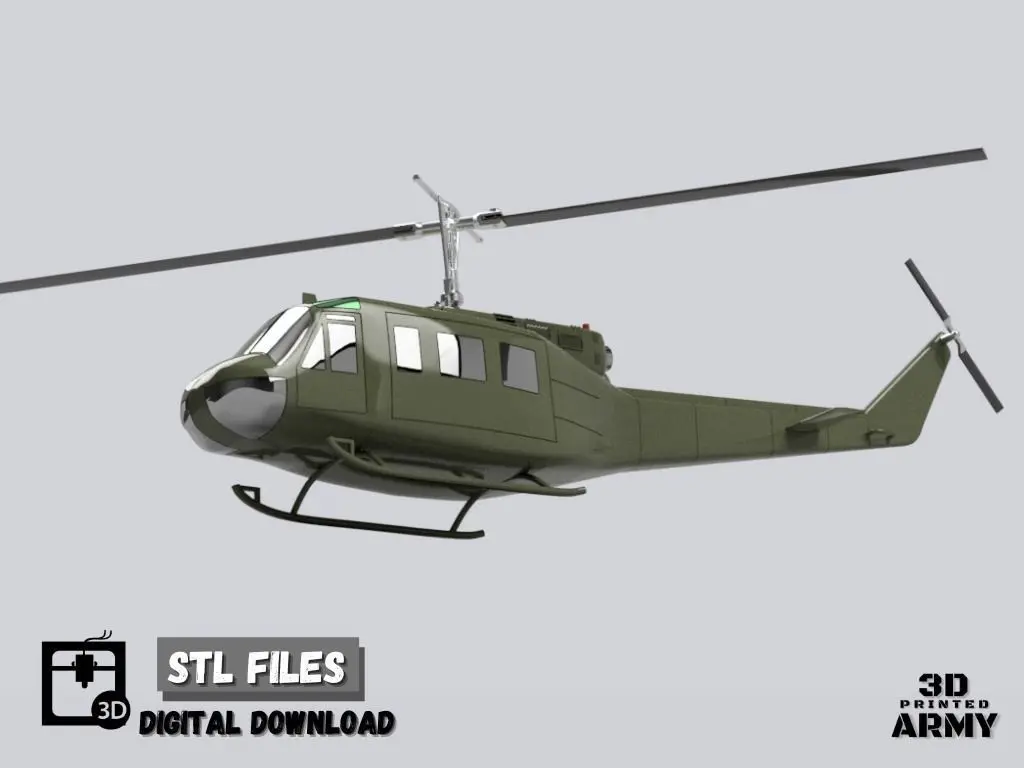 Dimensions :lenght :40 cm - 15,7 inchsrotor diameter : 42 cm - 16,5 inchsSCALE : 1/ 44The Bell UH-1 Iroquois (nicknamed Huey) is a utility military helicopter developed by Bell Helicopter to meet a 1952 US Army requirement for a medical evacuation and utility helicopter, and first flew in 1956. The UH-1 was the first turbine-powered helicopter produced for the United States military, and more than 16,000 have been built since 1960The Vietnam War saw for the first time the helicopter take a prominent place in the conduct of military operations. The Huey, through the variety of roles entrusted to him and his omnipresence, became practically a symbol of this conflict. United States Army Aviation Branch UH-1s flew 9,713,762 hours between October 1966 and 1973. 3D PRINTING SETTINGSThis model has been designed from scratch to be realistic but also easy to print and assemble a PDF guide is provided to help you to print your model and to assemble it correctly