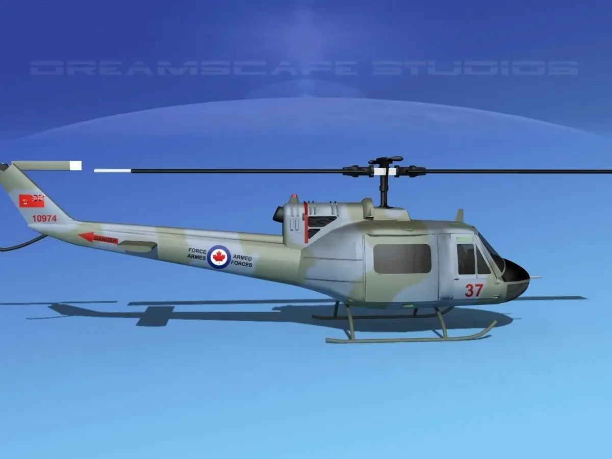 Bell UH-1B Iroquois V23 Canada Army This model was built near to scale. The model is fully textured. It comes with all materials and textures as shown. The main rotor and tail rotor are animateable. The side loading doors and crew doors can be closed and opened to reveal some good detail in the cabin and cockpit. The pilot and copilots seat include the armor and controls. The instrument panel is viewable from outside of the model. The rotors are somewhat detailed. The cabin includes the military light seats. These models come in several formats for immediate downloading.