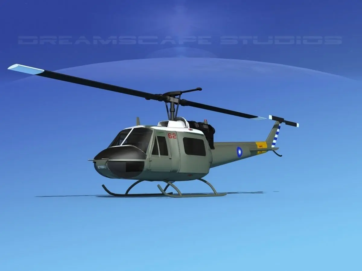 Bell UH-1B Iroquois V20 China This model was built near to scale. The model is fully textured. It comes with all materials and textures as shown. The main rotor and tail rotor are animateable. The side loading doors and crew doors can be closed and opened to reveal some good detail in the cabin and cockpit. The pilot and copilots seat include the armor and controls. The instrument panel is viewable from outside of the model. The rotors are somewhat detailed. The cabin includes the military light seats. These models come in several formats for immediate downloading.