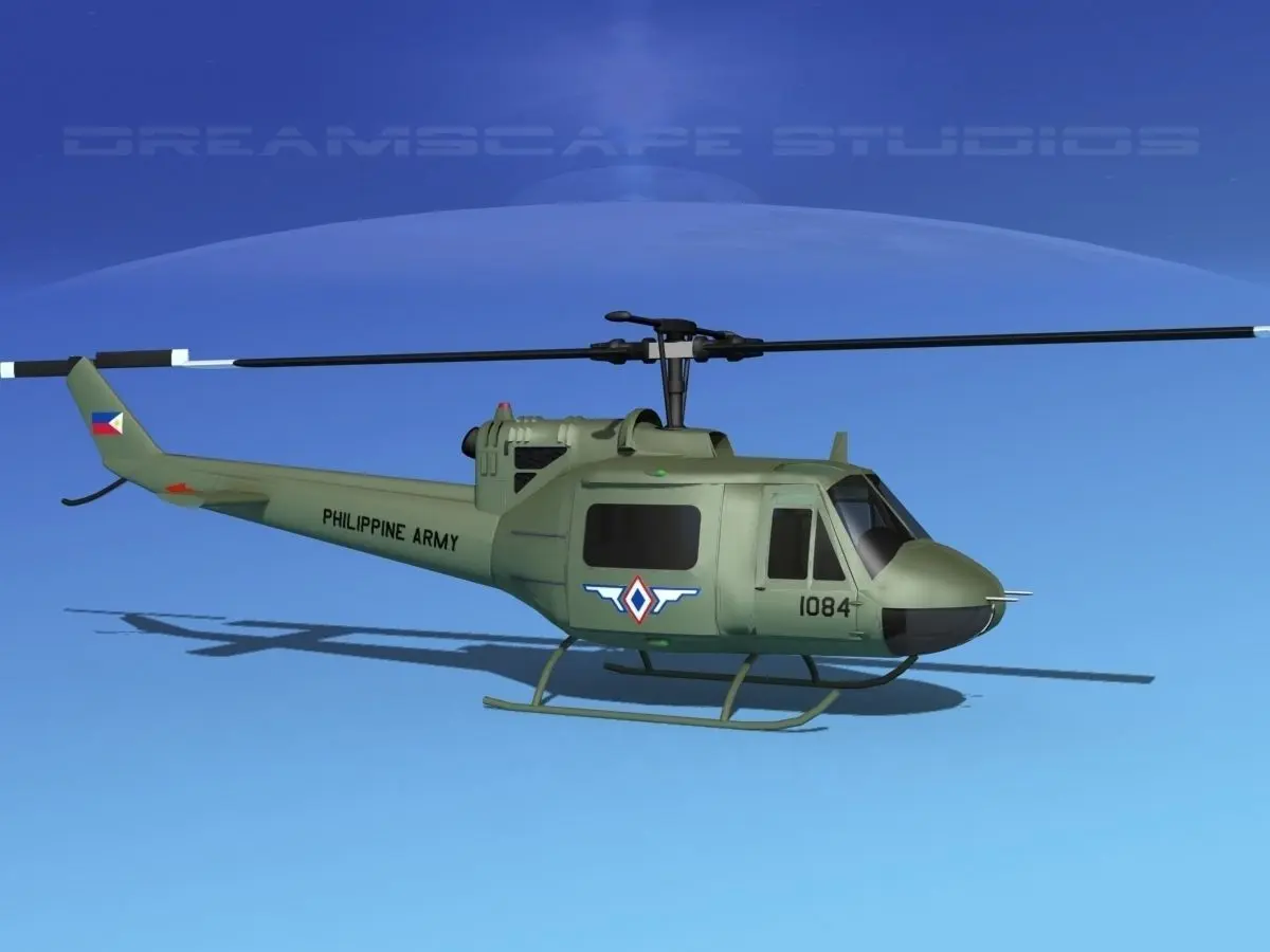 Bell UH-1B Iroquois V28 Philipines This model was built near to scale. The model is fully textured. It comes with all materials and textures as shown. The main rotor and tail rotor are animateable. The side loading doors and crew doors can be closed and opened to reveal some good detail in the cabin and cockpit. The pilot and copilots seat include the armor and controls. The instrument panel is viewable from outside of the model. The rotors are somewhat detailed. The cabin includes the military light seats. These models come in several formats for immediate downloading.