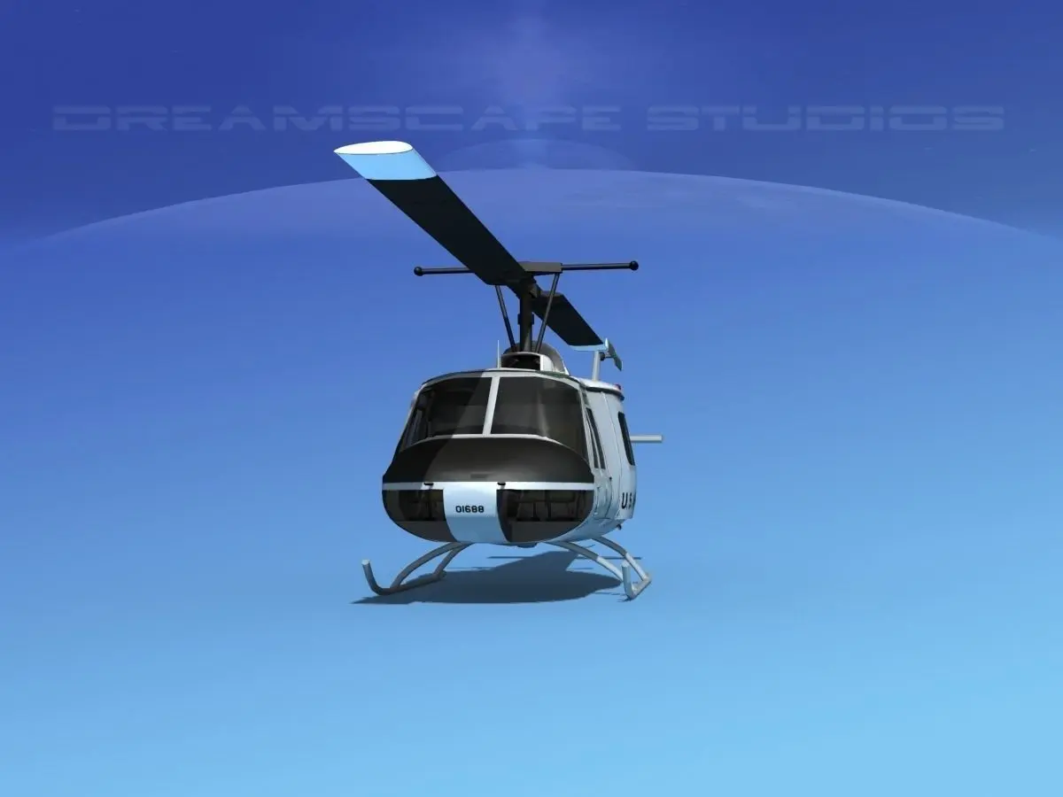 Bell UH-1B Iroquois V08 US Air Force This model was built near to scale. The model is fully textured. It comes with all materials and textures as shown. The main rotor and tail rotor are animateable. The side loading doors and crew doors can be closed and opened to reveal some good detail in the cabin and cockpit. The pilot and copilots seat include the armor and controls. The instrument panel is viewable from outside of the model. The rotors are somewhat detailed. The cabin includes the military light seats. These models come in several formats for immediate downloading.