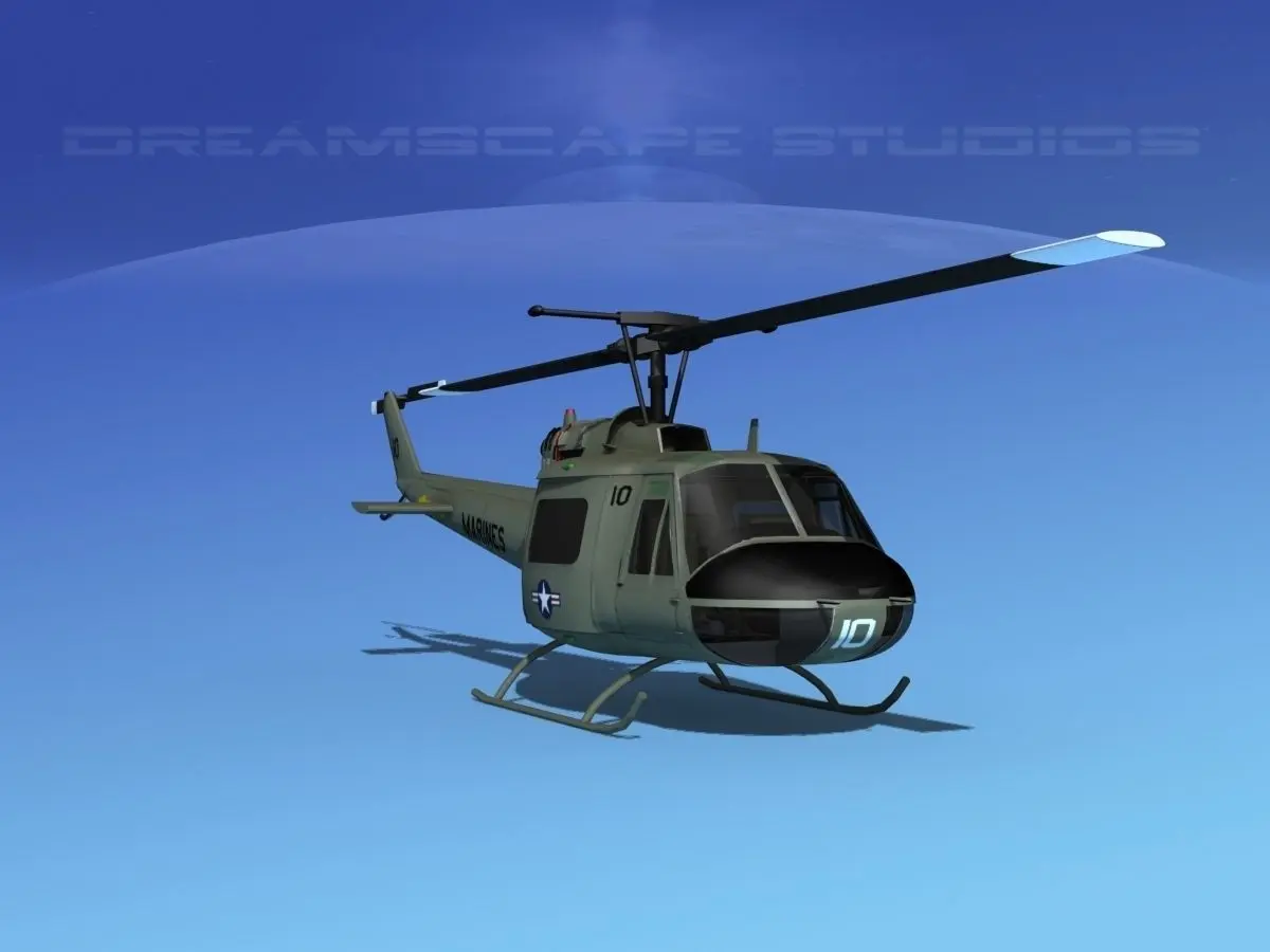 Bell UH-1B Iroquois V12 US Marines This model was built near to scale. The model is fully textured. It comes with all materials and textures as shown. The main rotor and tail rotor are animateable. The side loading doors and crew doors can be closed and opened to reveal some good detail in the cabin and cockpit. The pilot and copilots seat include the armor and controls. The instrument panel is viewable from outside of the model. The rotors are somewhat detailed. The cabin includes the military light seats. These models come in several formats for immediate downloading.