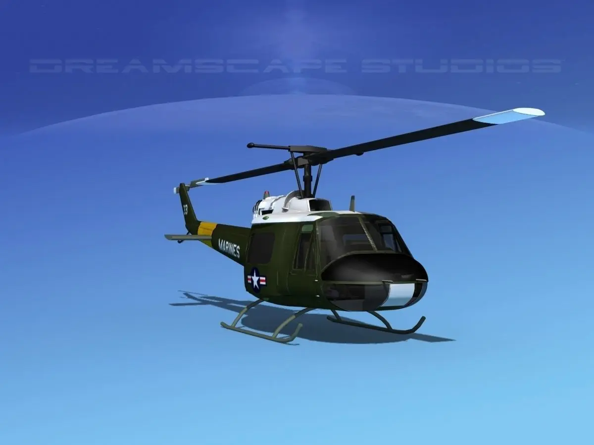 Bell UH-1B Iroquois V13 US Marines This model was built near to scale. The model is fully textured. It comes with all materials and textures as shown. The main rotor and tail rotor are animateable. The side loading doors and crew doors can be closed and opened to reveal some good detail in the cabin and cockpit. The pilot and copilots seat include the armor and controls. The instrument panel is viewable from outside of the model. The rotors are somewhat detailed. The cabin includes the military light seats. These models come in several formats for immediate downloading.