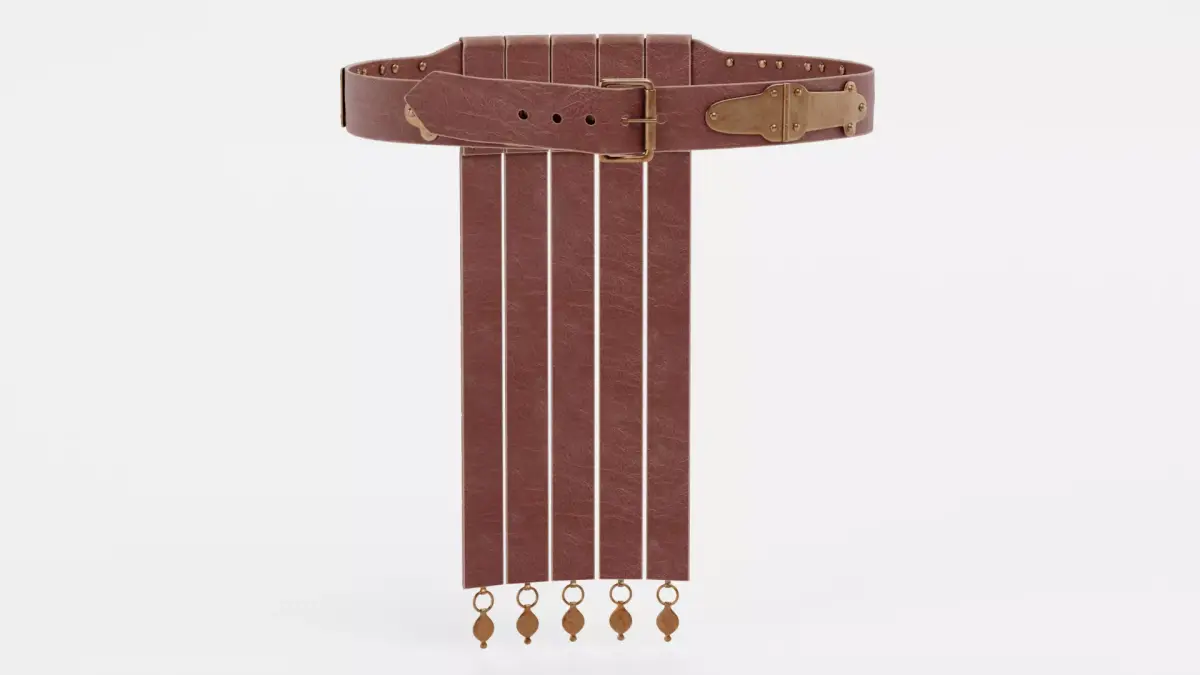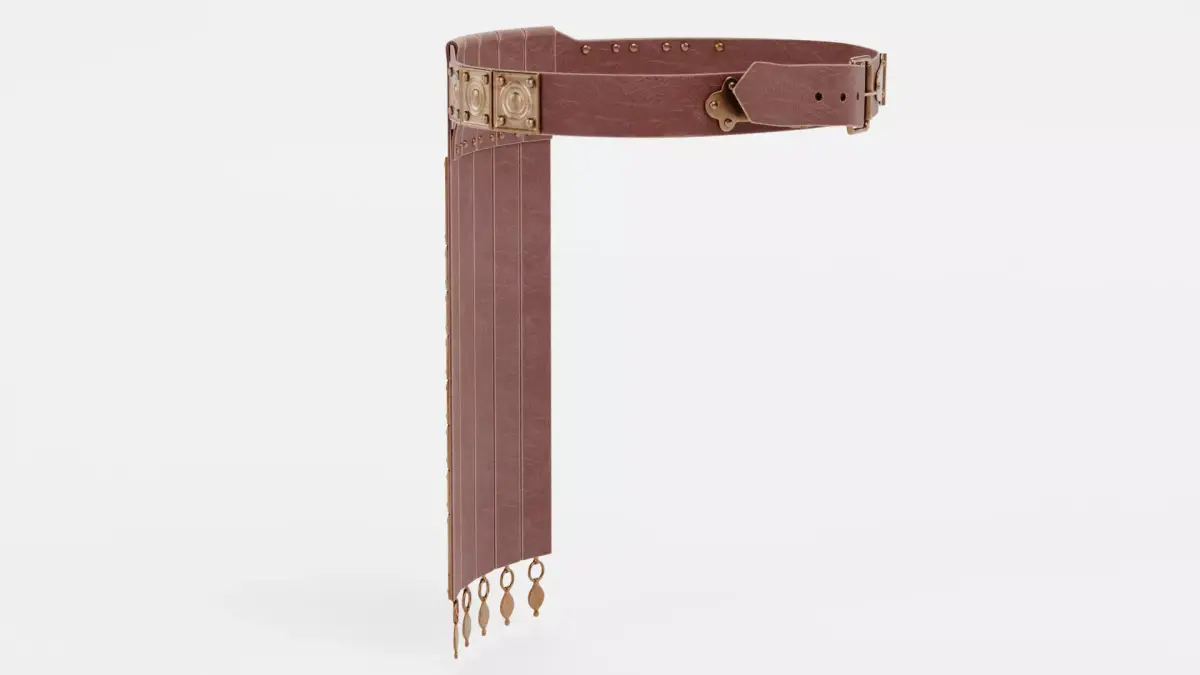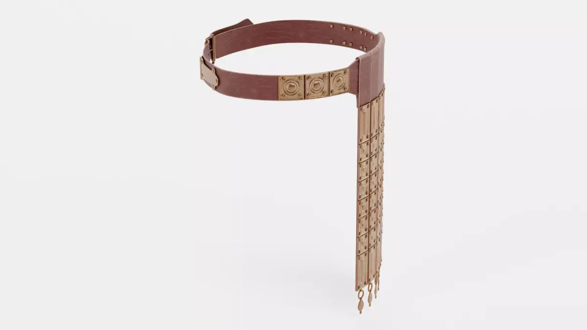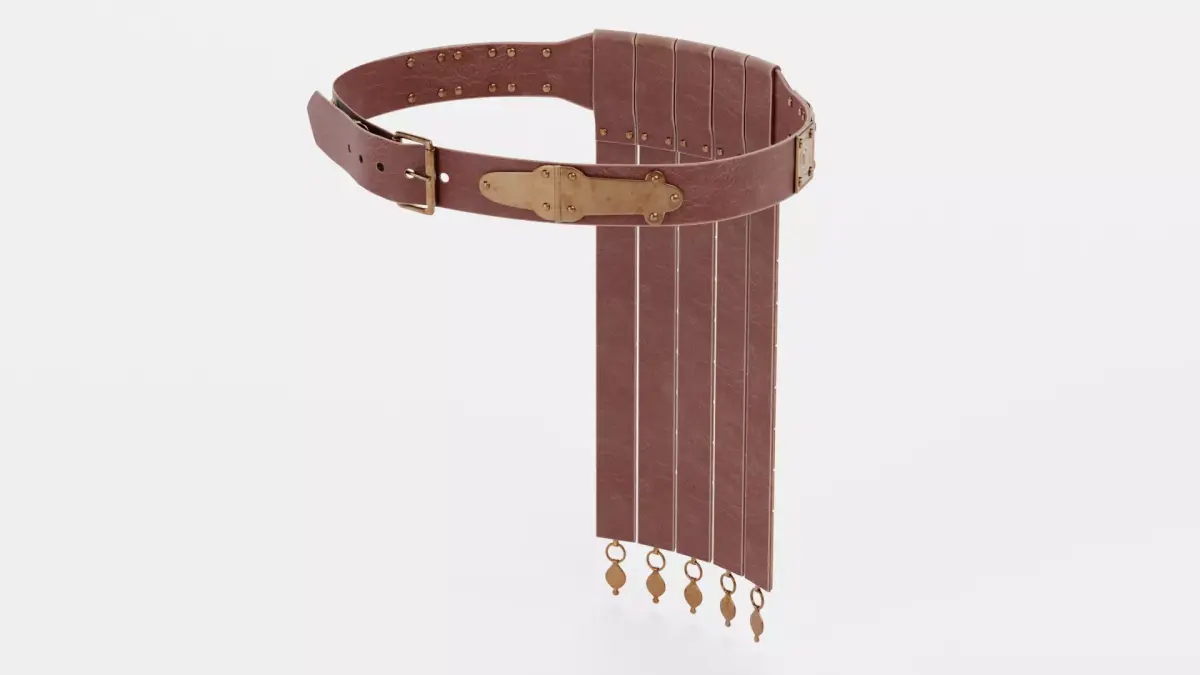 Aged Roman legionary belt, showing natural wear and patina. Leather and metal elements feature surfaces with subtle aging. Surface details, including the hanging straps, remain finely modeled, capturing the authentic character of a well-used armor piece.