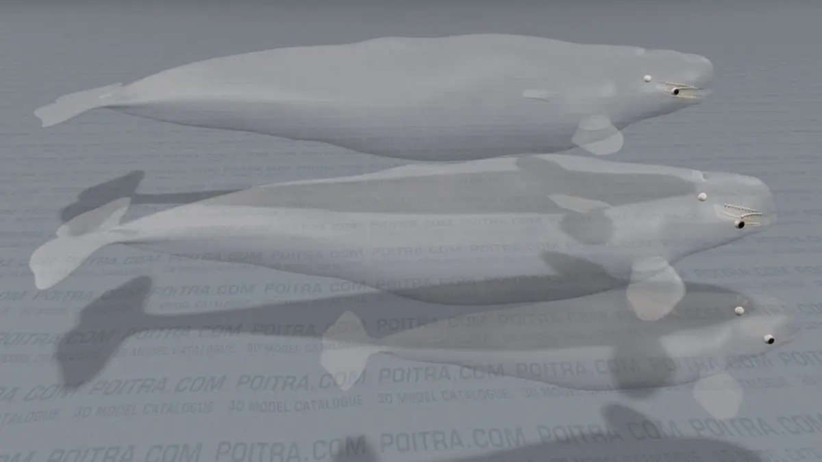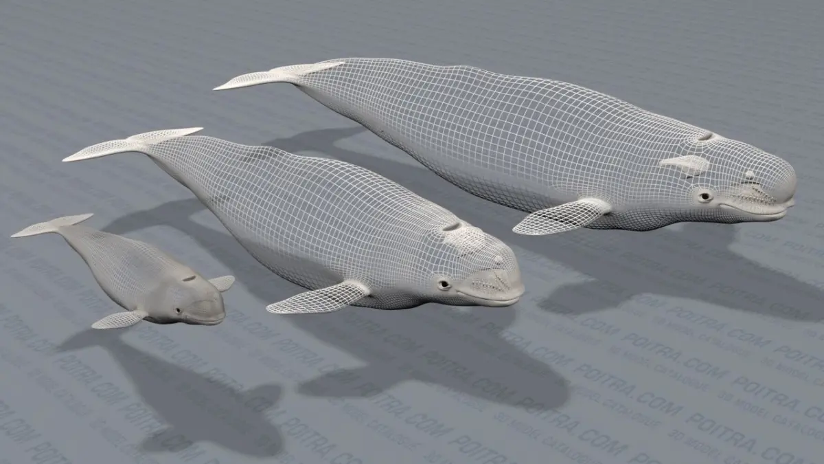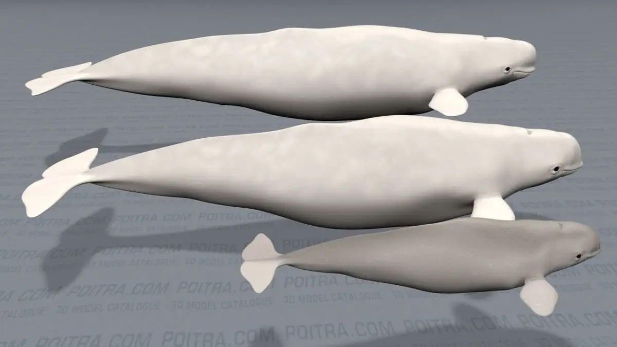 3D Model Beluga Whale (Delphinapterus Leucas) Family Group - known as the white whale and the canary of the sea! This textured whale family collection includes an Adult Male Beluga Whale, an Adult Female Beluga Whale, and a Beluga Calf or Baby Whale (see details below and rendered images). Each adult whale features separate sets of upper and lower teeth, all three whales feature separate/individual eyes (see rendered images).