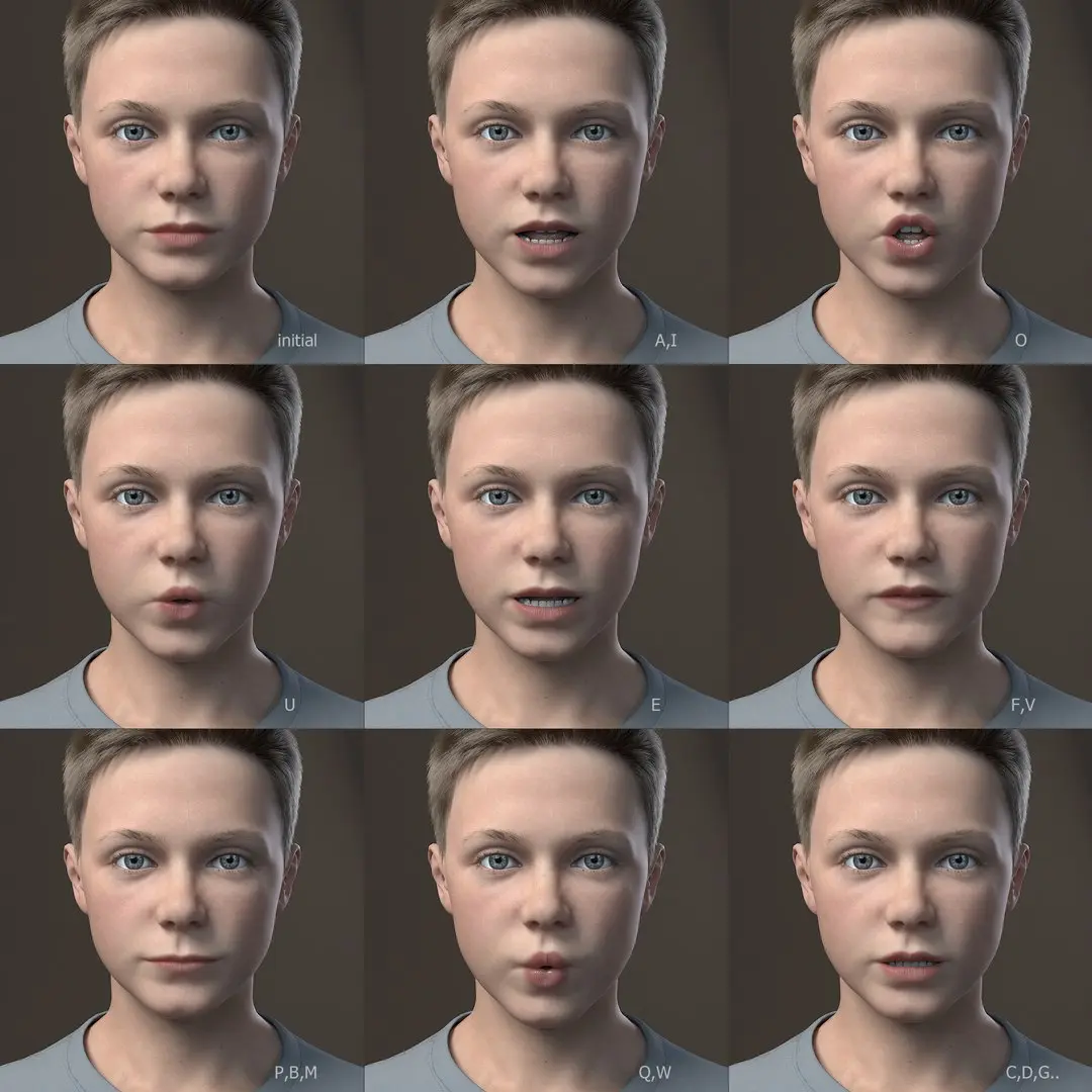 Rigging is done using biped and skin modifier. Biped has three twist links everywhere: upper arms, forearms, thighs and calves; four spine bones. Blended morph system with graphic user interface is used for facial animation.