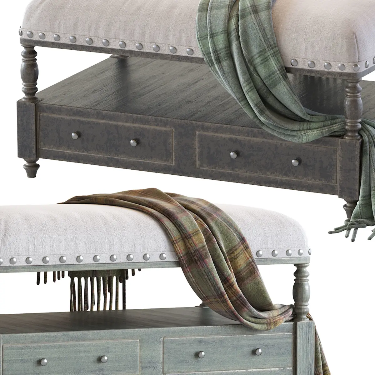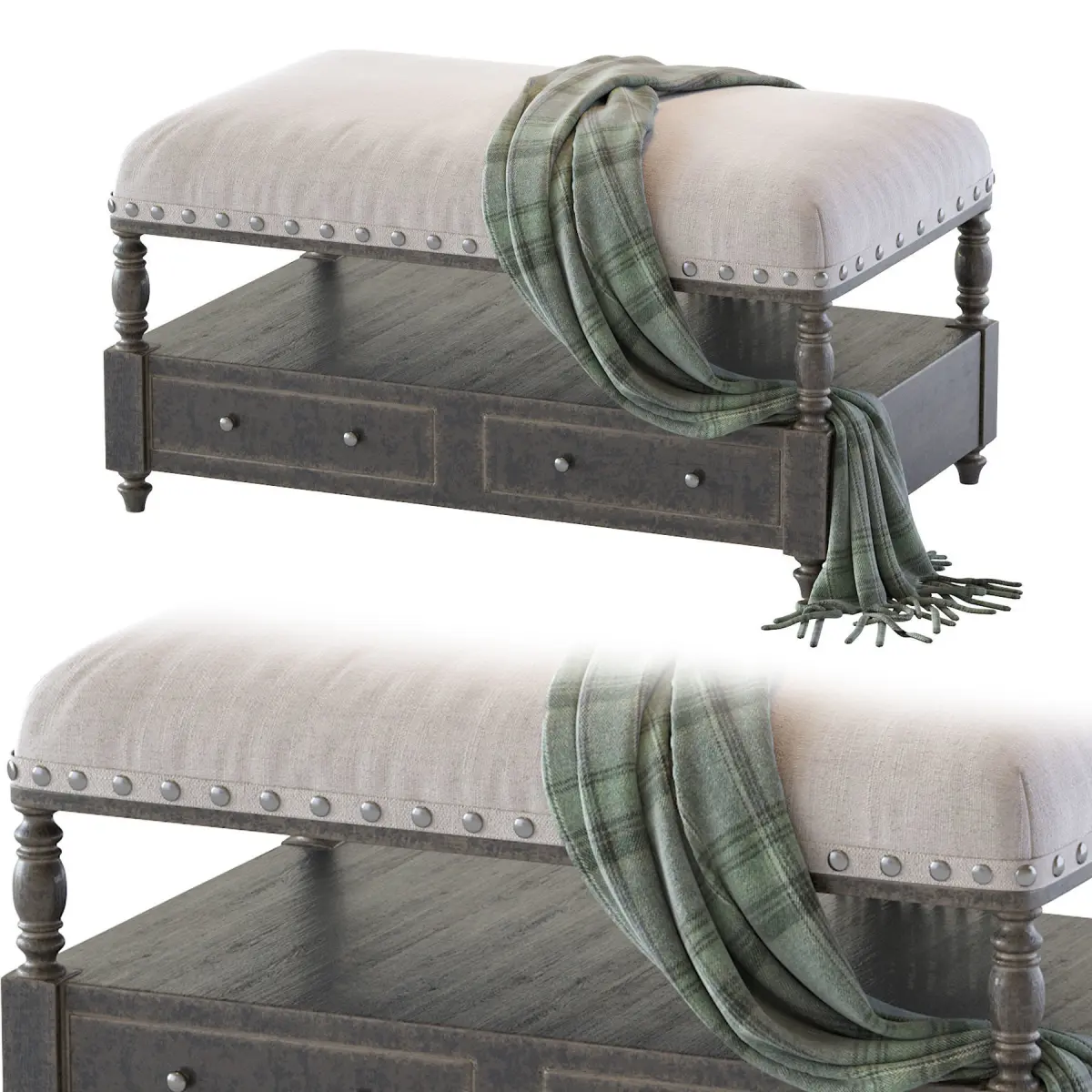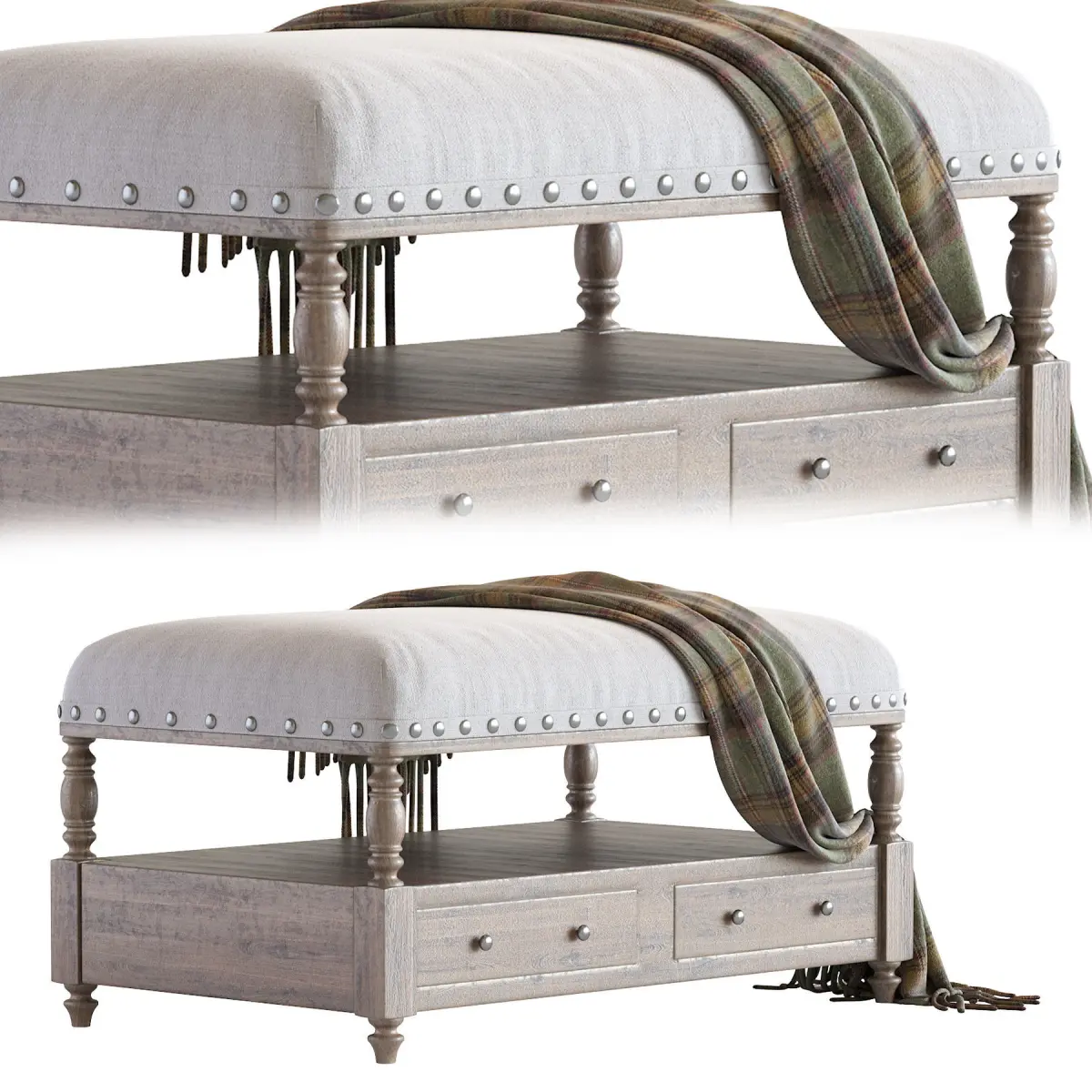 Uttermost's Benches Combine Premium Quality Materials With Unique High-style Design. With The Advanced Product Engineering And Packaging Reinforcement, Uttermost Maintains Some Of The Lowest Damage Rates In The Industry. Each Product Is Designed, Manufactured And Packaged With Shipping In Mind. Hand Turned Hardwood With A Light Weathered Finish Which Shows Off The Natural Graining. Covering Is A Neutral White Canvas Blend Accented With Silver Finished Nail Heads. Two Generous Drawers And Shelf Make This A Wonderful Storage Solution. Bench Is Fin Hand Turned Hardwood With A Light Weathered Finish Which Shows Off The Natural Graining. Covering Is A Neutral White Canvas Blend Accented With Silver Finished Nail Heads. Two Generous Drawers And Shelf Make This A Wonderful Storage Solution. Bench Is Fin