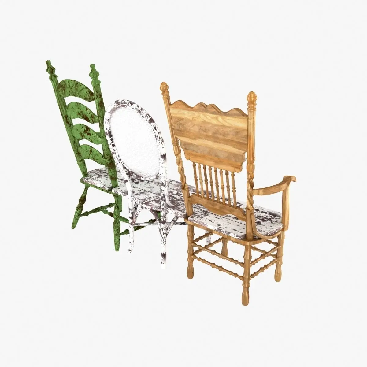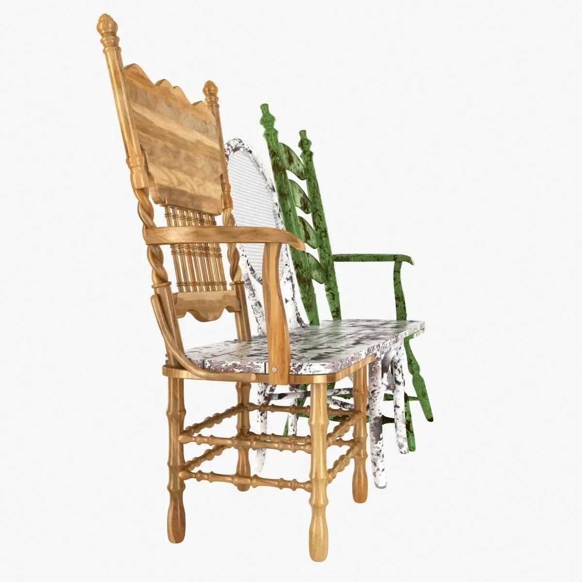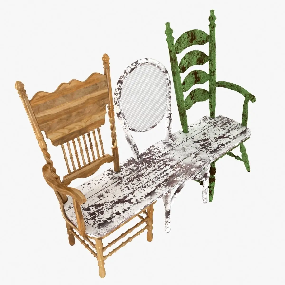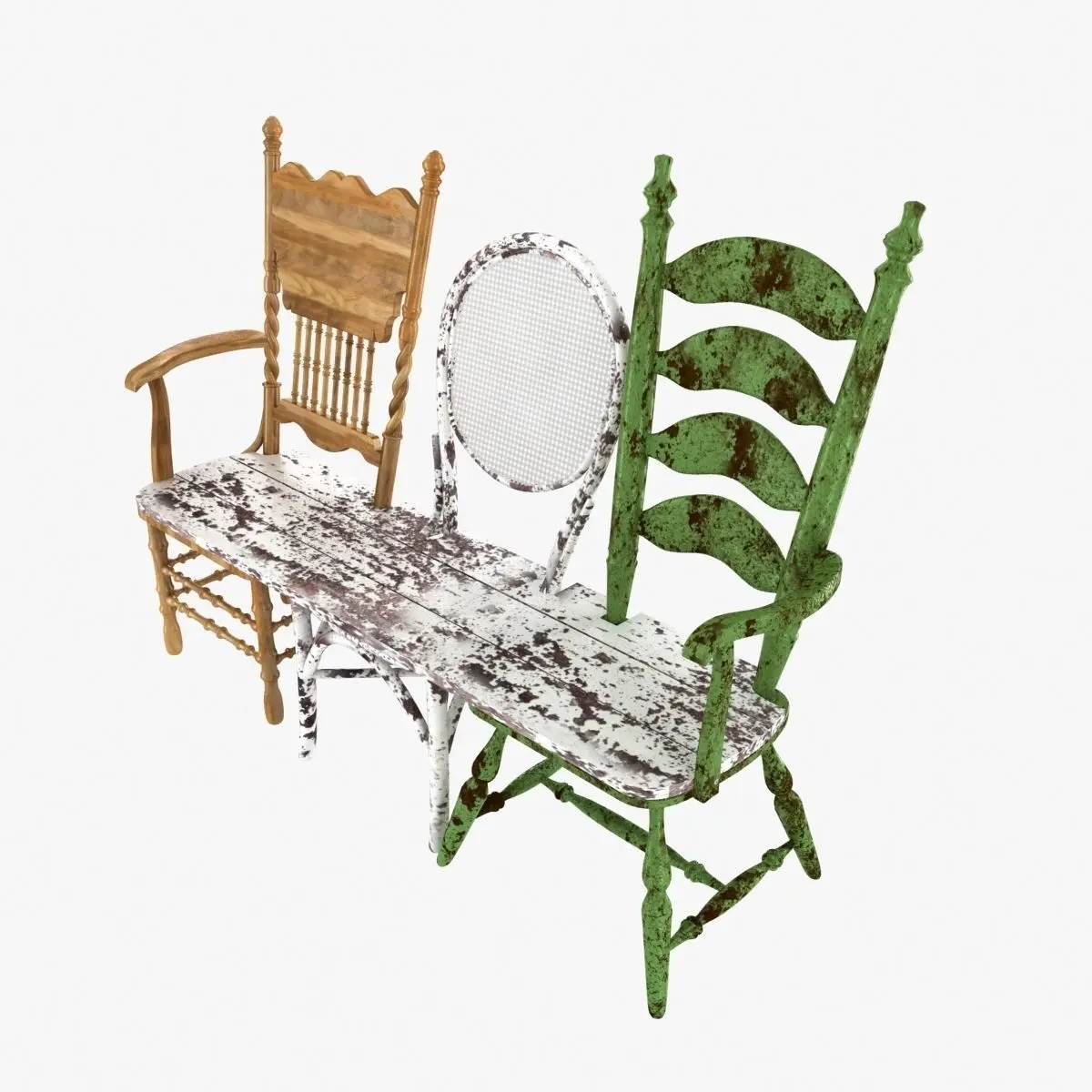 bench made from 3 wood chairgreen painted, white painted and natural walnut colorall 3 chairs unite 3 long boardspaint at all chairs are old and damaged.