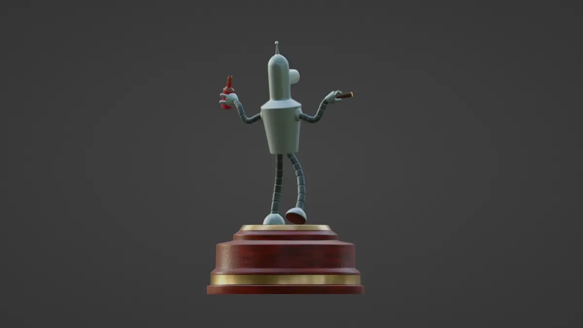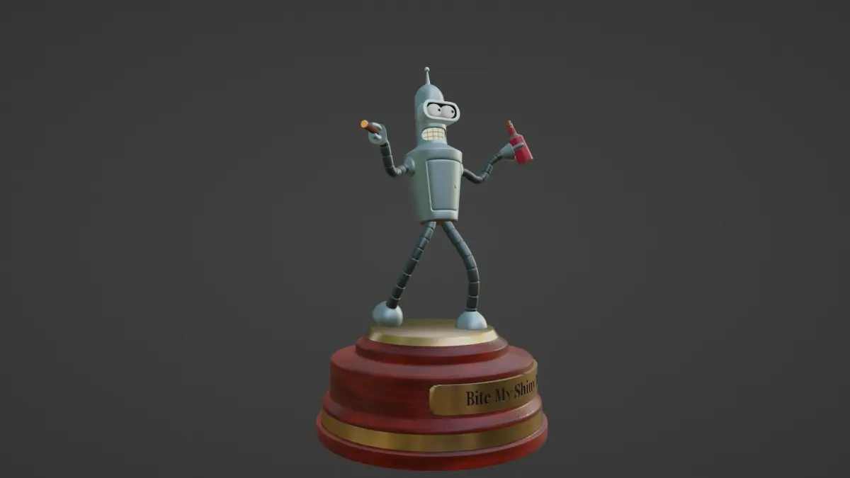 Classically posed Bender model from Futurama. Posed with a beer and cigar and stood on a trophy like Plynth with his catchphase engraved on the plaque.