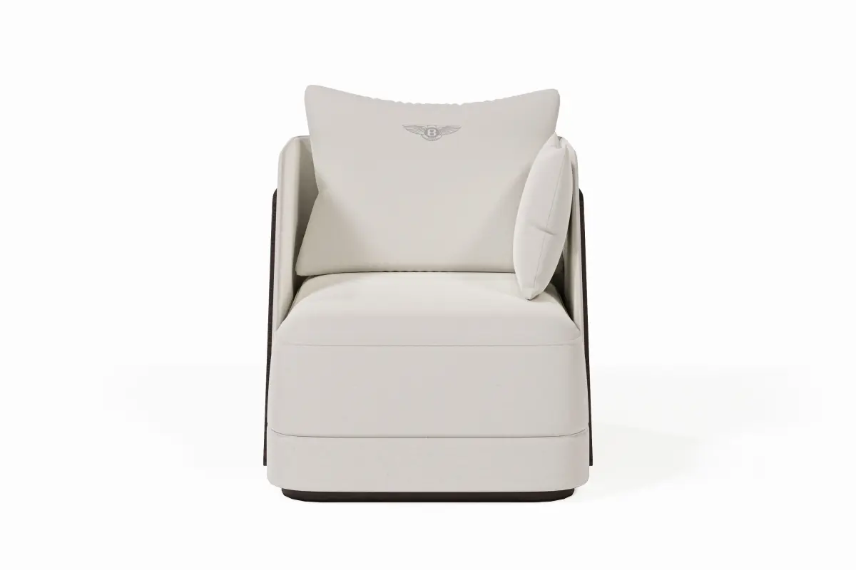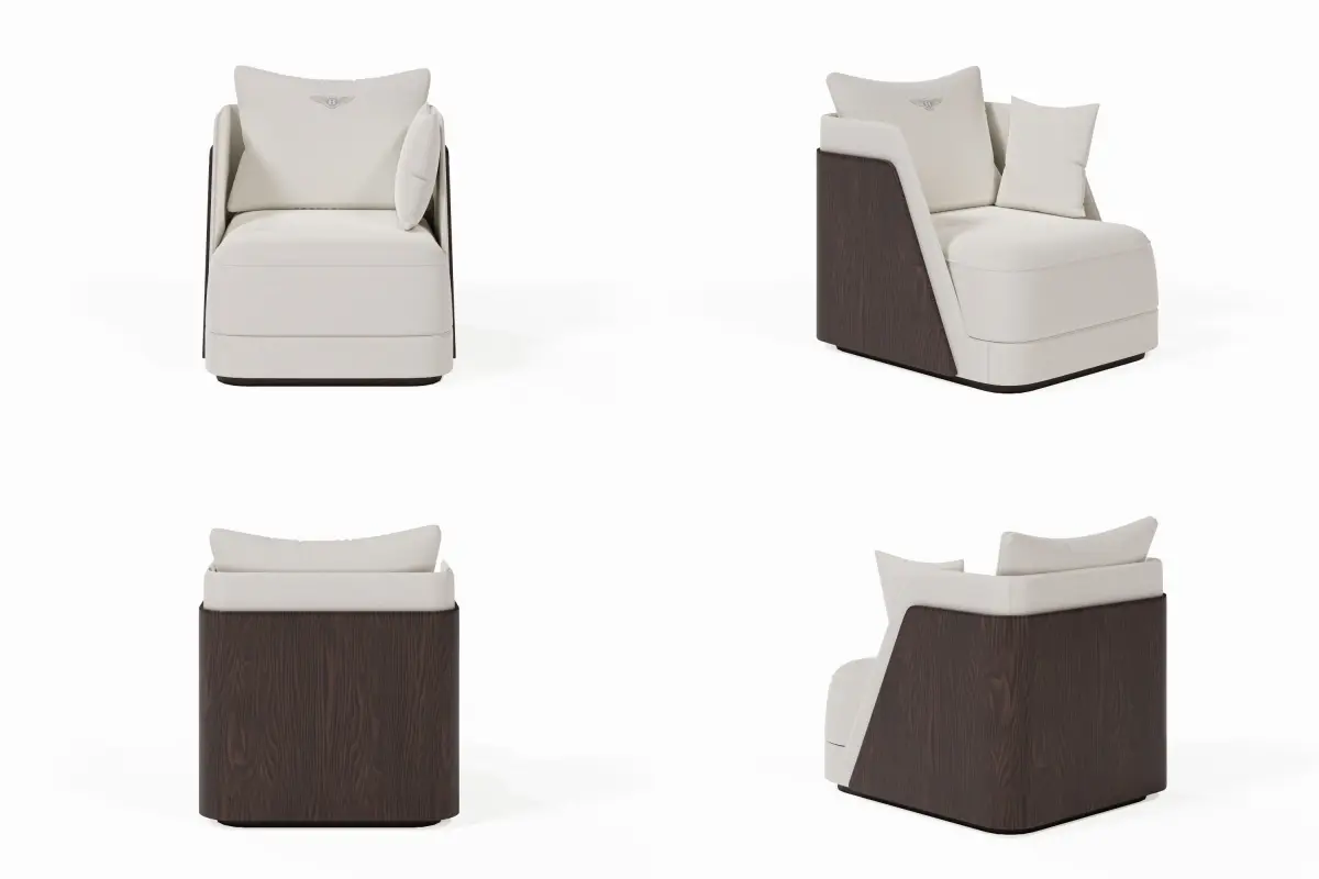 Made of soft fabric with the Bentley logo on it. Various materials have also been used, such as lacquered wood and white leather. Varnished wood gives more luxurious look. Along with the armchair, there is also a cushion, which is also made of soft fabric material.