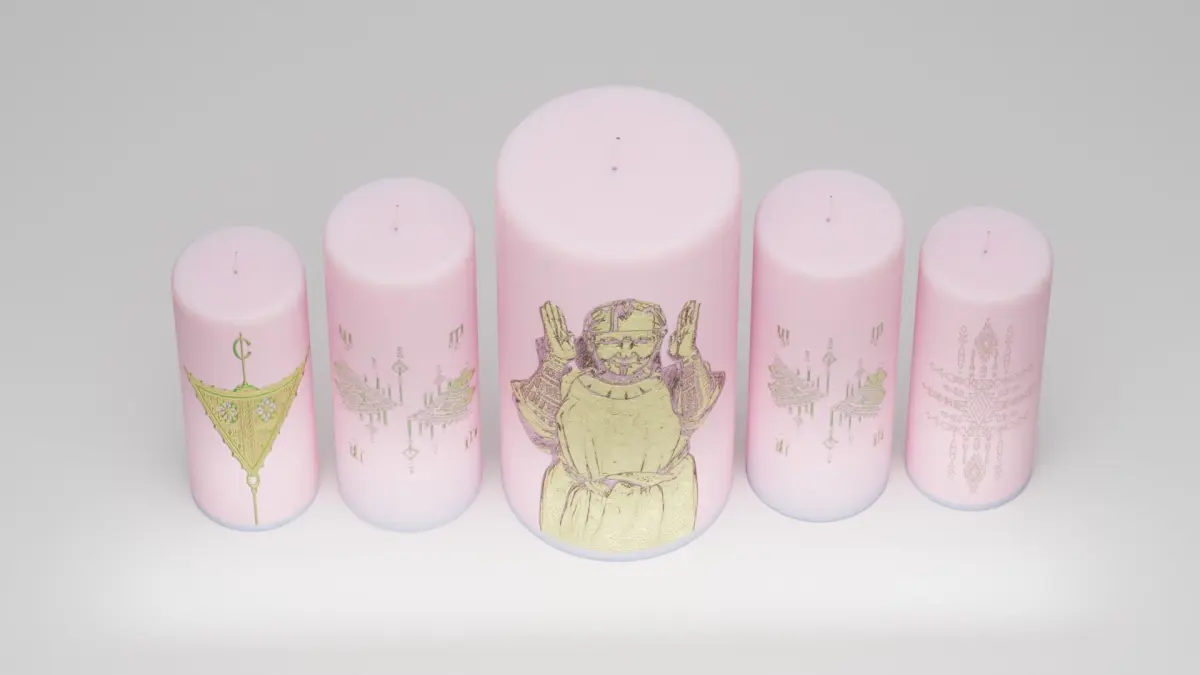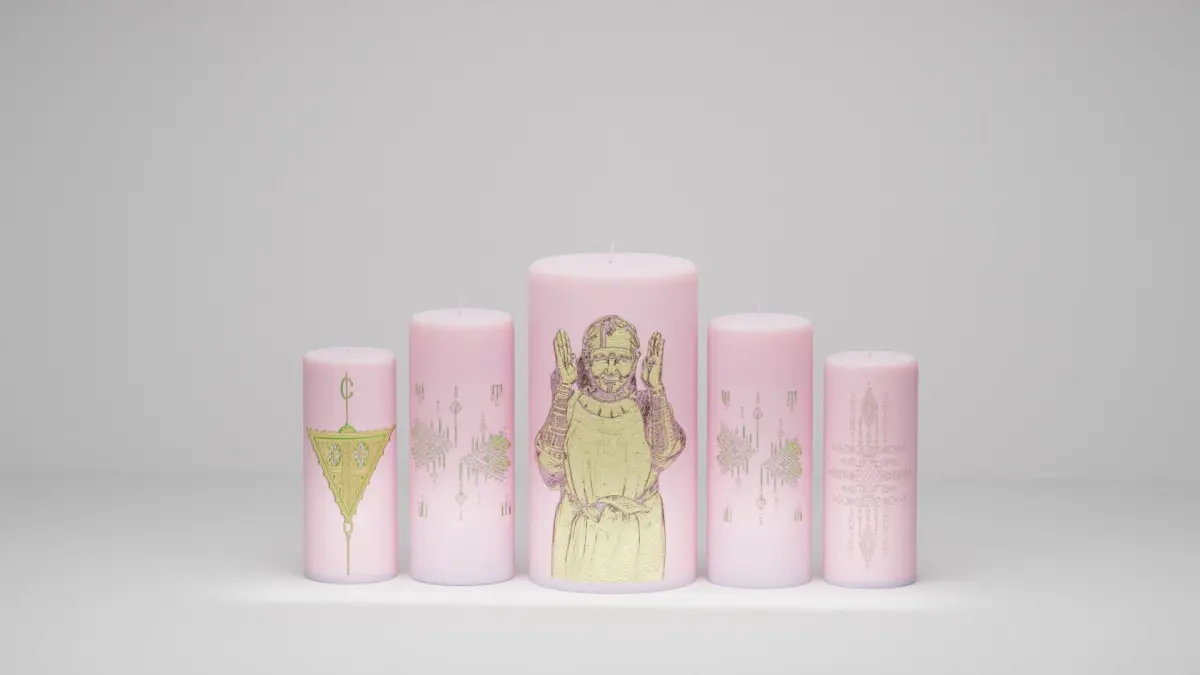 This pack includes 5 different candles and 3 candlesticks.