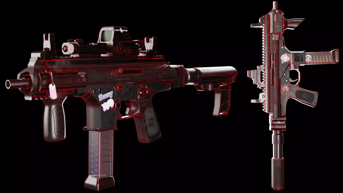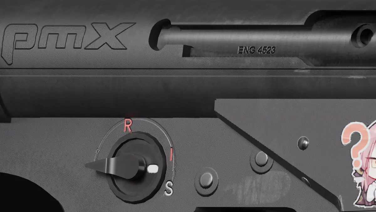 Polycount: PMX (base) 17,361 Tris 8,678 verts | Magazine 1,272 Tris, 635 verts, Cartridge. 444 Tris, 224 verts attach_cqcutie 6,111 Tris, 3,136 verts | attach_urbtac 9,368 Tris, 4,746 Verts | charm 1,708 tris, 856 verts