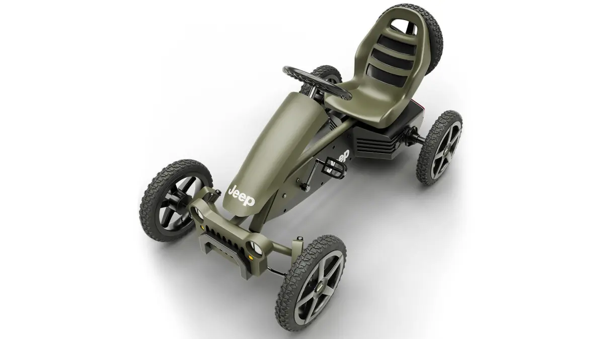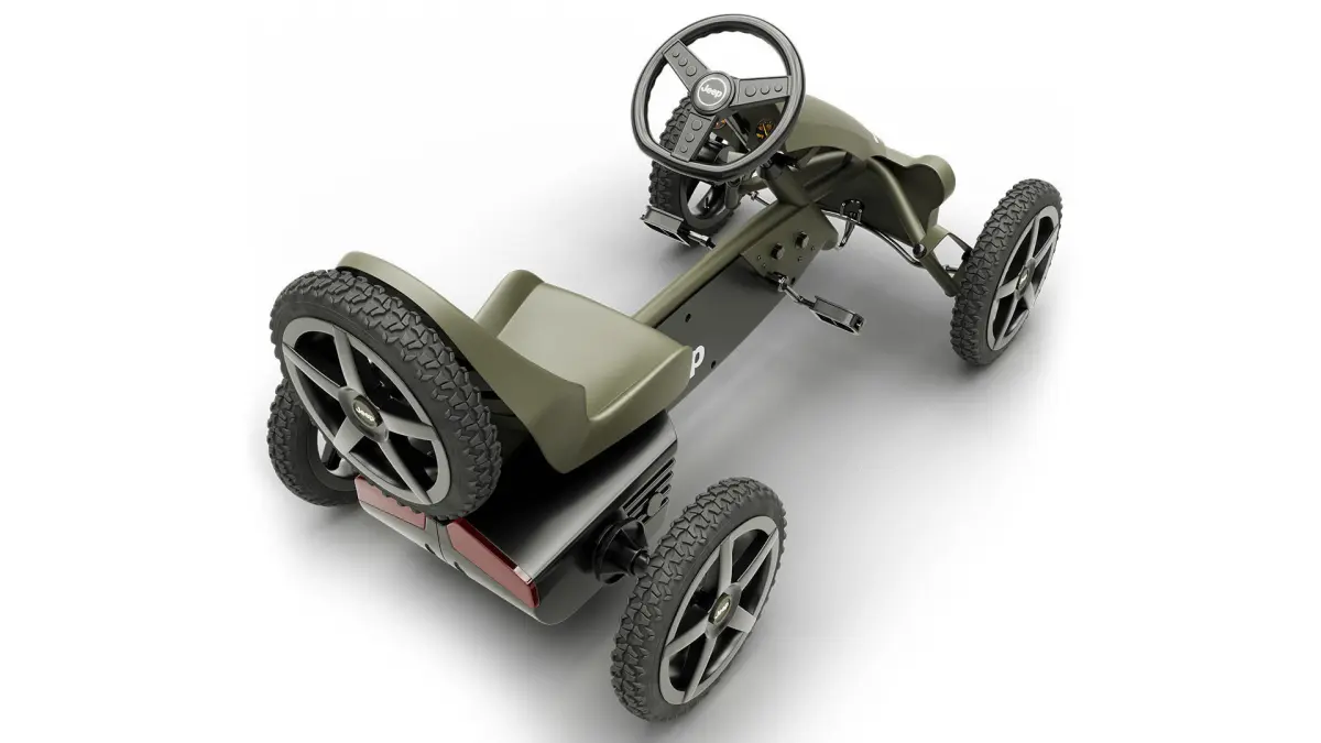 Jeep Adventure pedal go-kart:Everyone will be envious when you whizz past on this beautifully-designed go-kart. The Jeep Adventure is a light and compact go-kart letting you travel the narrowest paths with ease. The unique BFR system ensures that you can brake with your pedals, and after coming to a halt, you can immediately pedal backwards!