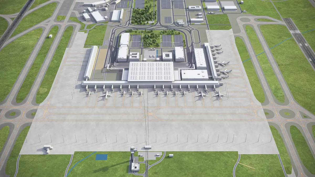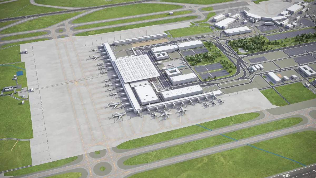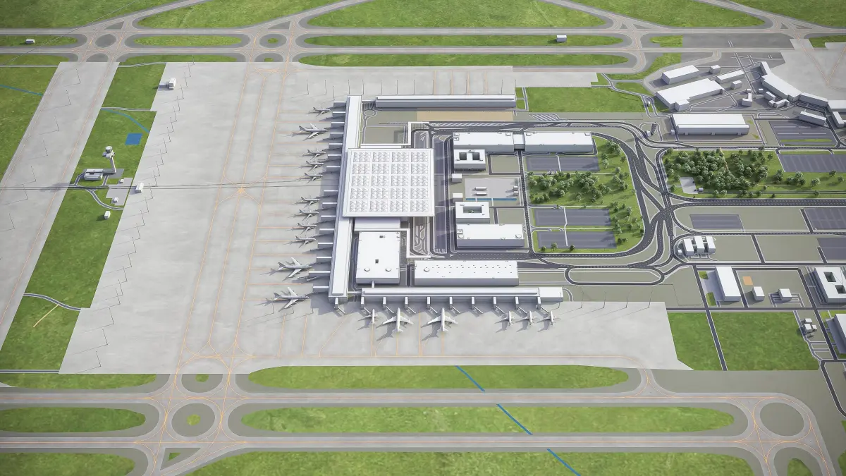 This is exact and accurate to-scale 3D model of Berlin Brandenburg Airport - BER and its surrounding area based on GIS data (May 2020)