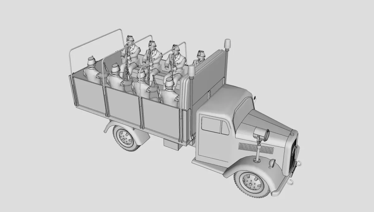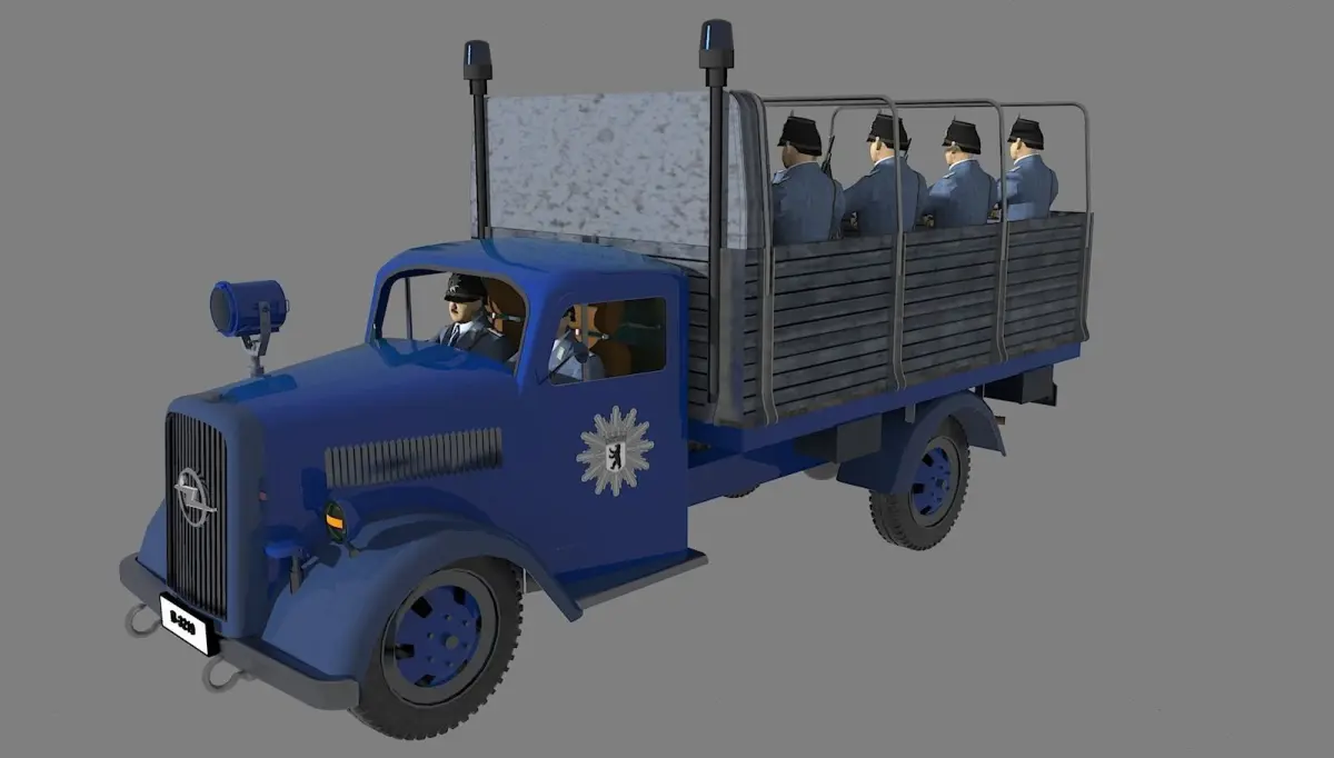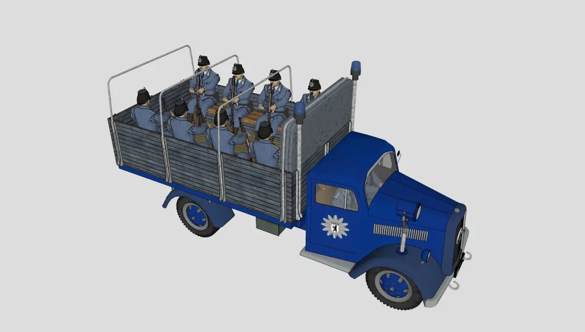 Berlin police task force of the 1950s, also known as the raid command. The police officers wear uniform model 47. The shako was introduced in 1951 and was worn until the 1960s.In order to give the police a uniform, uniformed image in public, it was decided in 1947 to obtain a uniform uniform for the three western sectors, which was issued at the beginning of 1948 and was called the Model 47.The police officers wear this model, which was worn until the Lippschitz model was introduced in 1961. The black belt also contains the striped pouch, the so-called star box and the handgun. On the belt lock is the police star with the Berlin coat of arms.The black shako was presented to the Berlin population on September 30th, 1951 on the occasion of the large police show in the Olympic Stadium. Before that, a peaked cap in the same color as the uniform was worn on Model 47. The patrol officer wore long cloth trousers with his skirt; boot trousers were also used for special units.