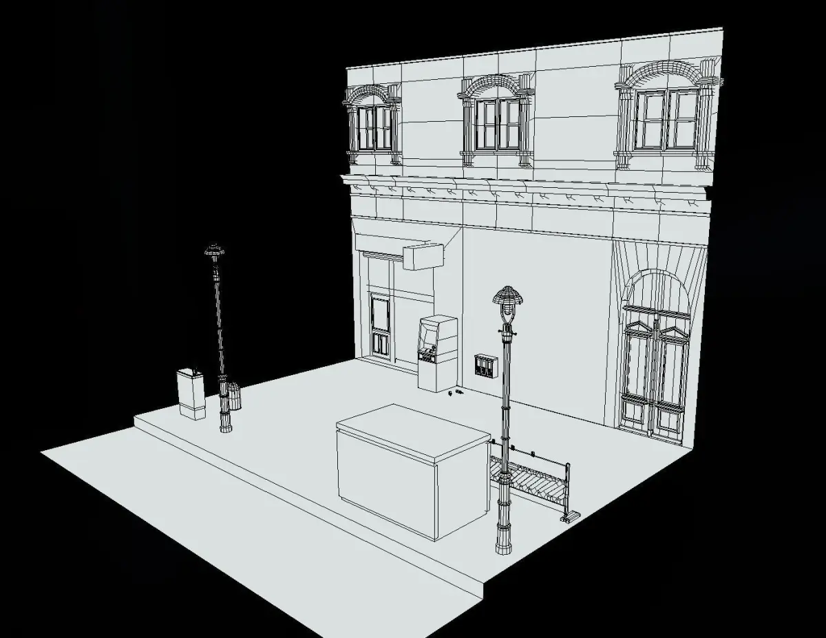 Lowpoly street based on the look of Berlin. Some of the posters and stickers are made with AI. The rest of the textures such as grime, graffiti, leafs etc. are painted in Photoshop and the models are made with Blender.