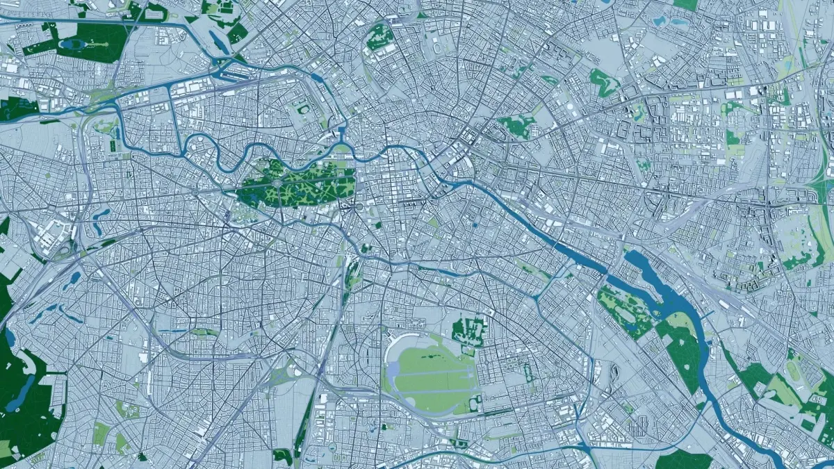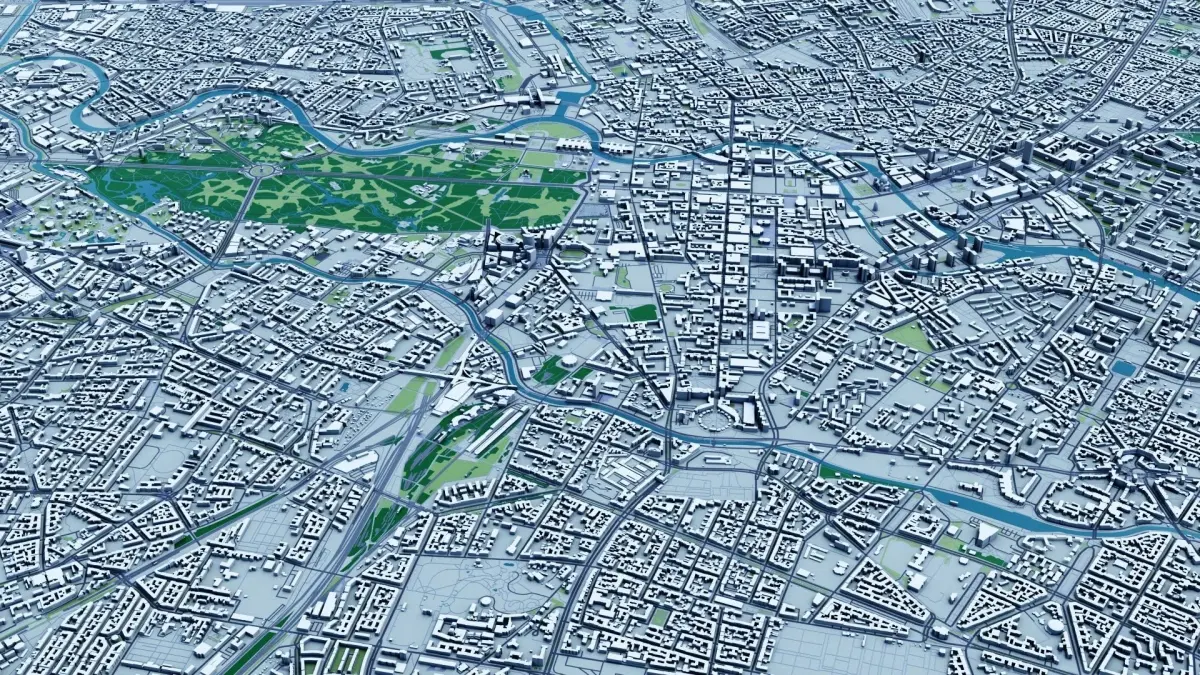 -3D Buildings-Terrain-Roads + Railways + Pedestrian Paths-Vegetation + Forest map-Water map