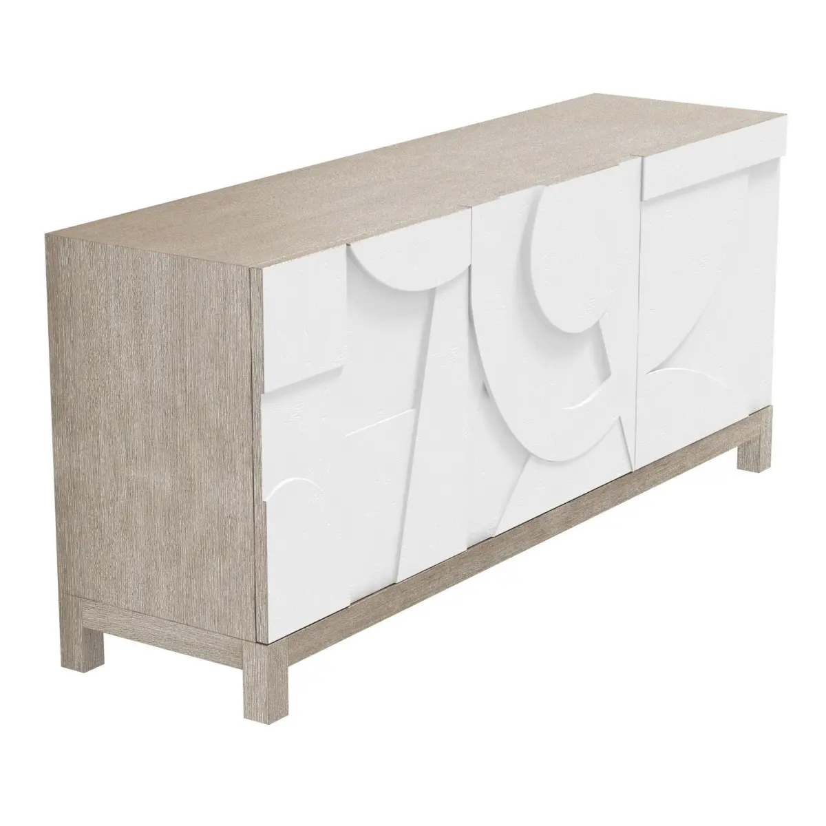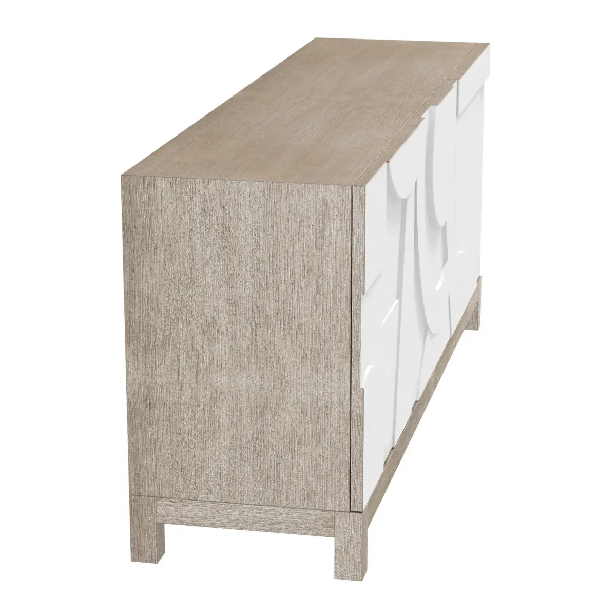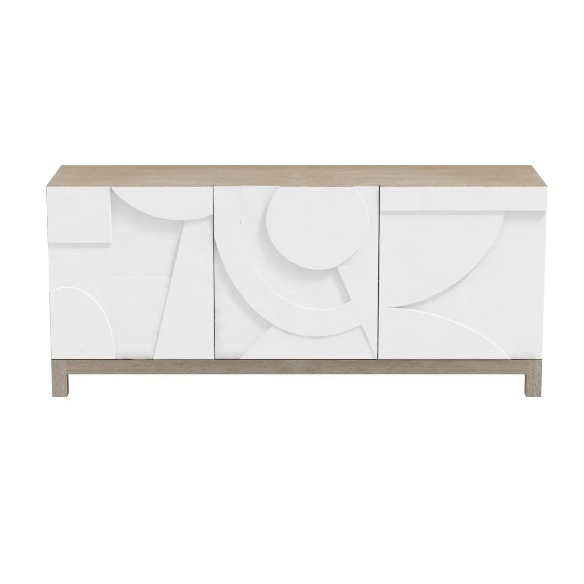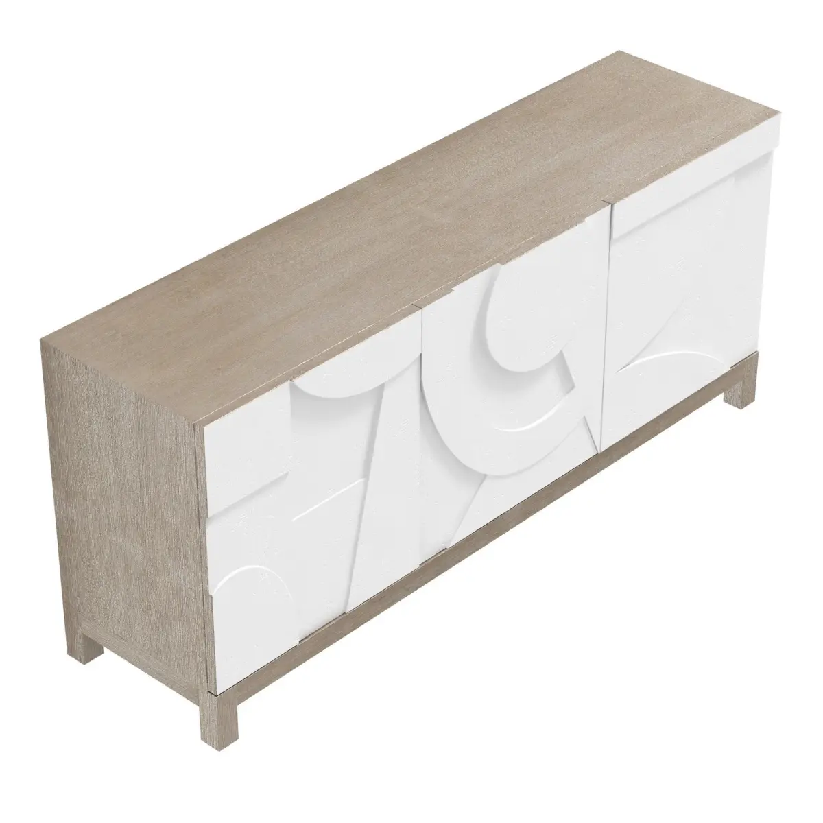 The inspiration for the Brindisi buffet is clear to see as it showcases a Cubist style. Interconnected dimensional designs are cast in resin on each door front in a Crema faux stone finish. The frame is in the Sandbar finish on veneered white oak. Suitable for dining storage or for media components, the doors open to reveal adjustable and fixed shelving, as well as a soft-close drawer with a hand-pull cutout.White oak veneers, faux stoneSandbar finish on case and baseThree push-to-open doors with soft-close hingesCast resin dimensional design on each door front in Crema faux stone finishTwo adjustable/removable shelves, vents and one covered grommet hole behind each left and right doorOne fixed shelf with a center drawer with hand-pull cutout and brown Guardian cloth silverware insert behind center doorStorage space above and below center drawer, each with vents and a covered grommet holeSix legs with adjustable glides (includes two back support legs)Anti-tip kit and instruction sheetSuitable for use with TVFollow TV manufacturer's instructions to prevent tippingsizeW: 71.88 in D: 19 in H: 32 in