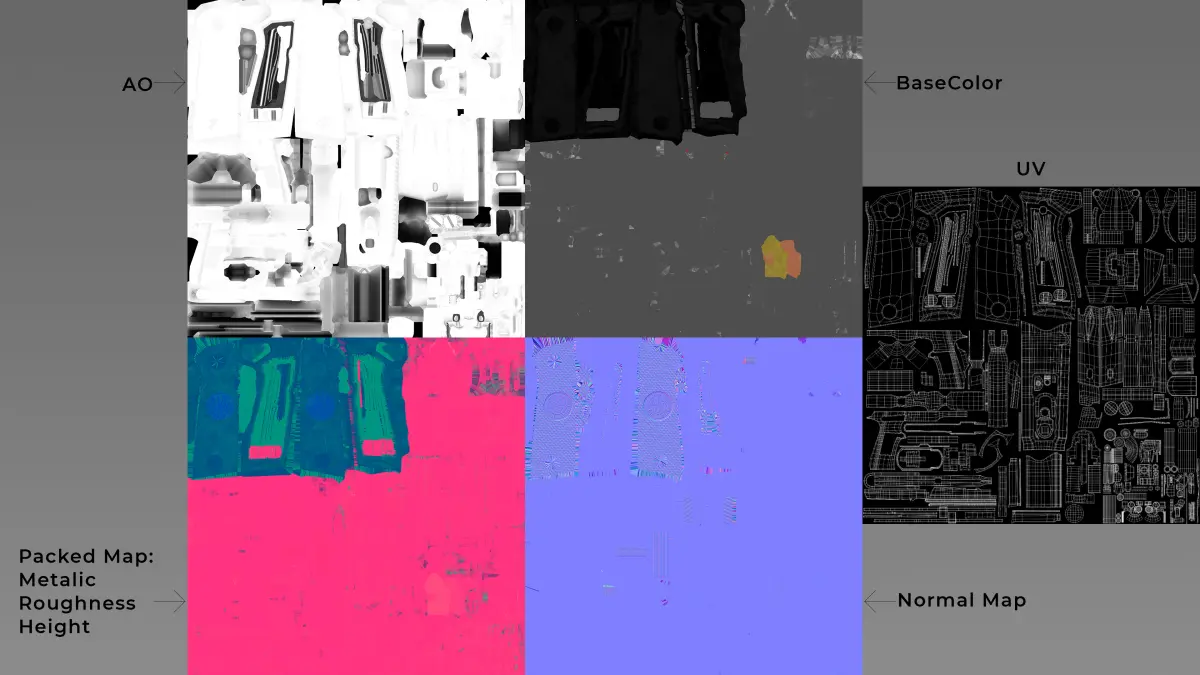 INCLUDES• Meshes: Quad & triangulated – pistol, magazine, bullet• Textures (4K PNG – PBR):BaseColor, Normal (DirectX -Y), AOMRH packed map (Metalness=R, Roughness=G, Height=B)Unpacked grayscale maps in /Unpacked folder• 2 renders, 2 wireframes• Maya scene (.ma, clean hierarchy)