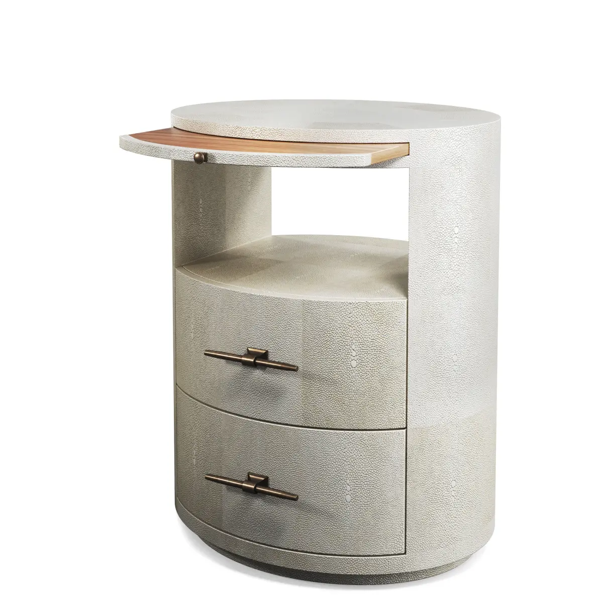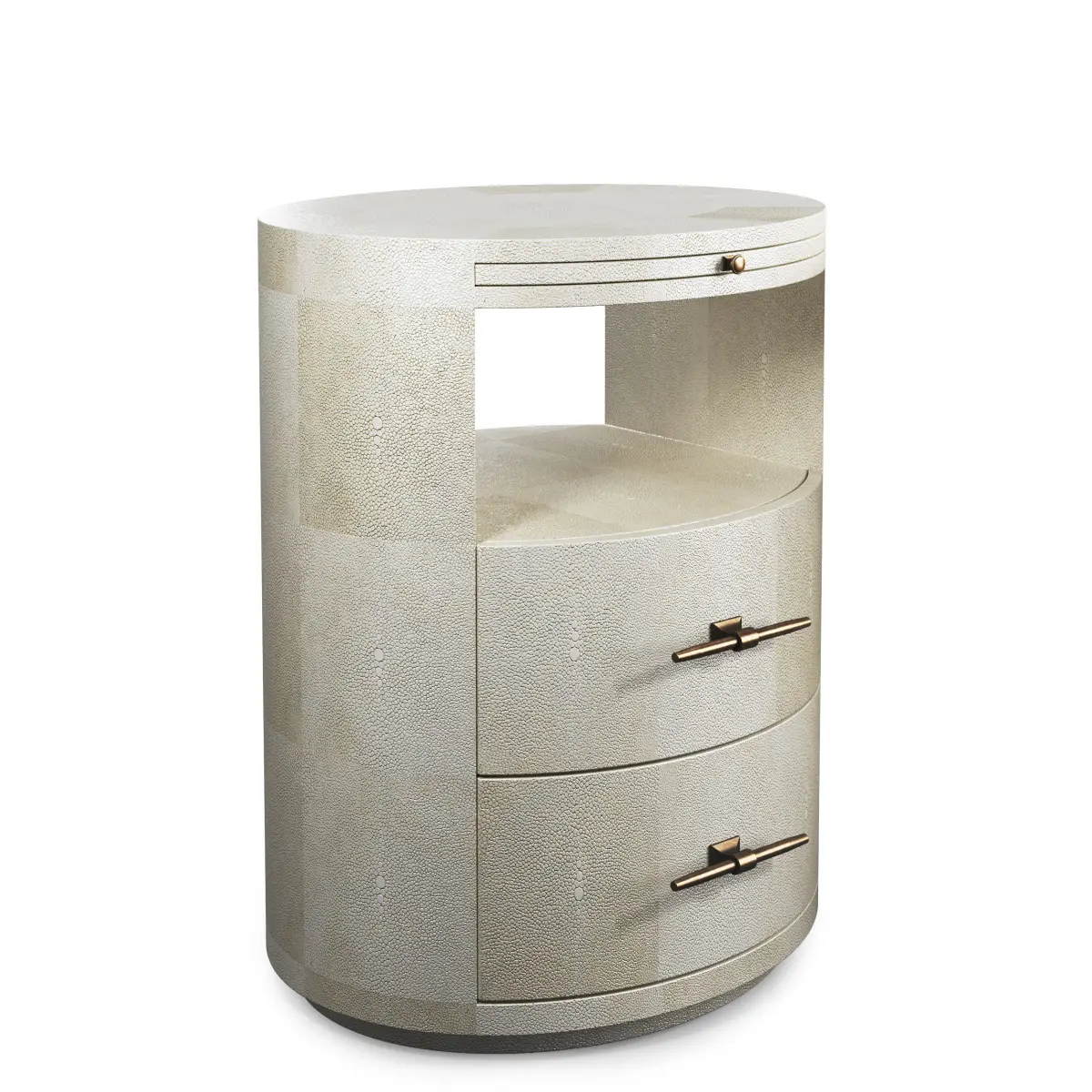 The Shagreen Berwick Nightstand is part of the very exclusive and luxurious bespoke furniture by Simon Orrell designs. A complementary piece of bedroom furniture produced in Shagreen Leather / Bronze / Wood materials.