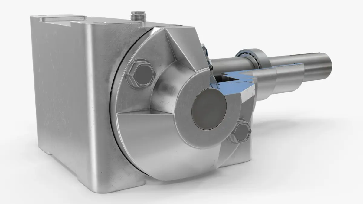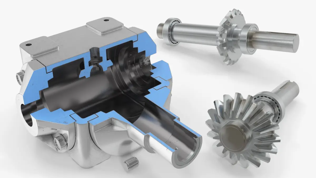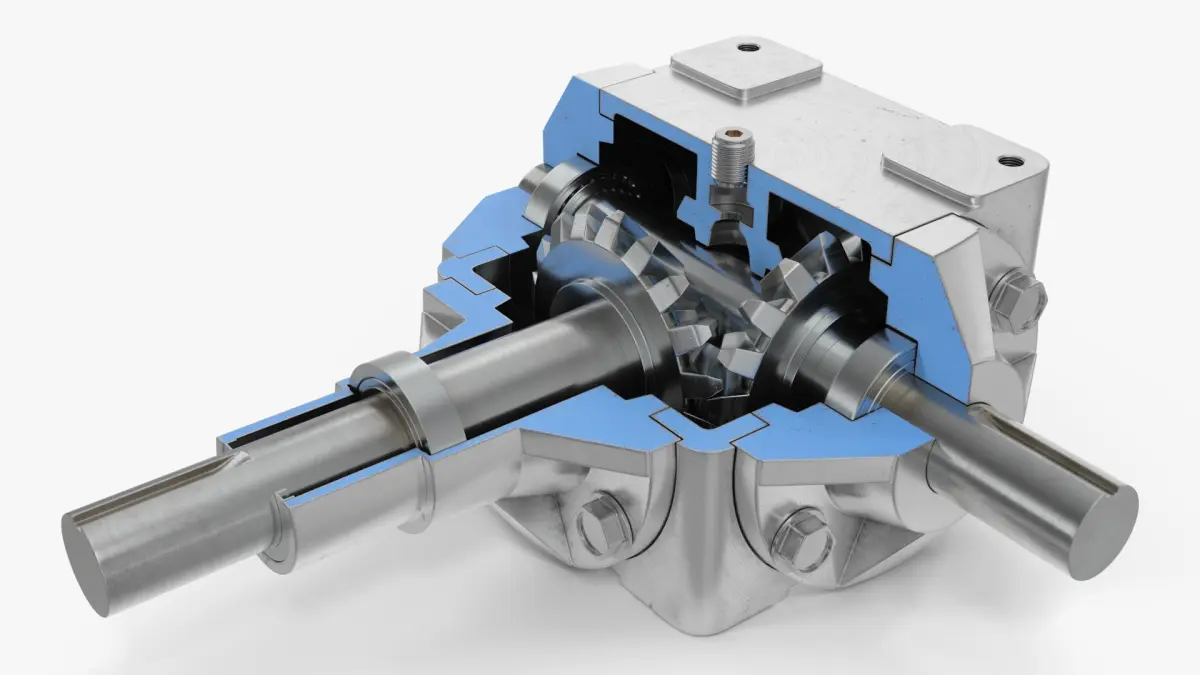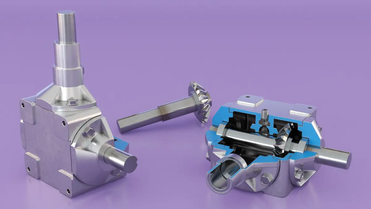 Bevel Gearbox Cutaway Section View is a 3d model of a bevel gearbox, showcasing an essential mechanical component used for power transmission in various machinery.