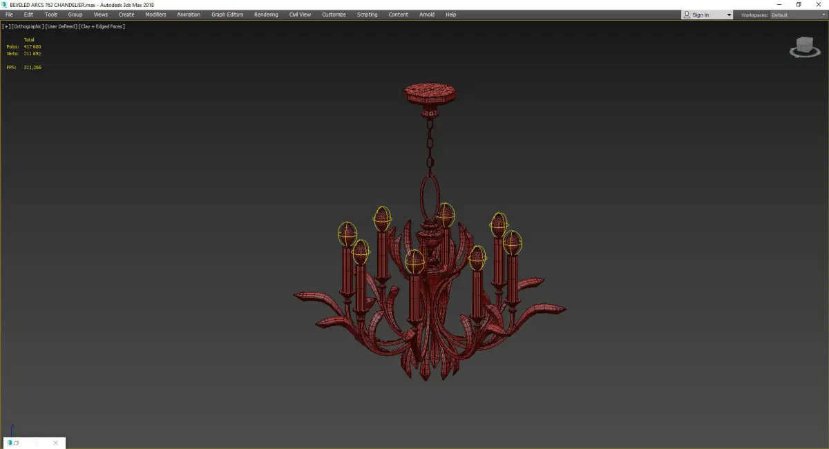 Name: BEVELED ARCS 763 CHANDELIERVersion: 2013Preview: NoUnits: MillimetersDimension: 1096.74 x 1096.74 x 956.88Polys: 417 600XForm: NoBox Trick: NoModel Parts: 1Render: V-RayFormats: 3Ds Max 2013, OBJ, FBX