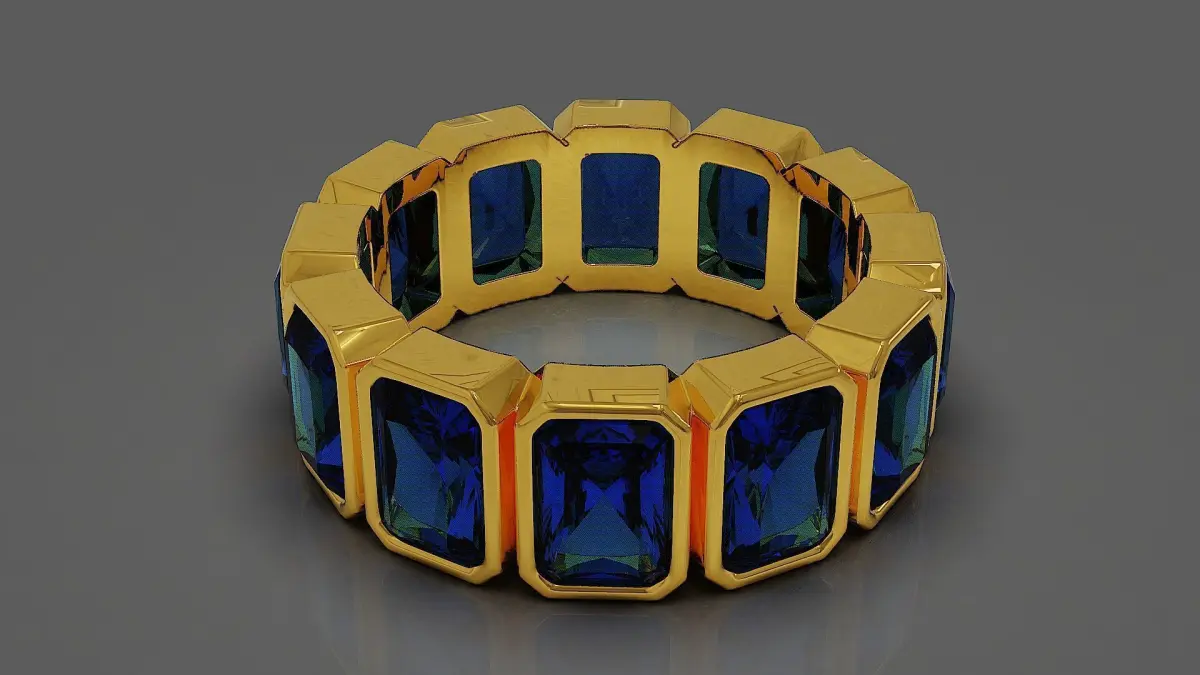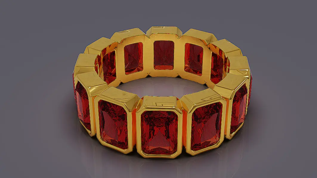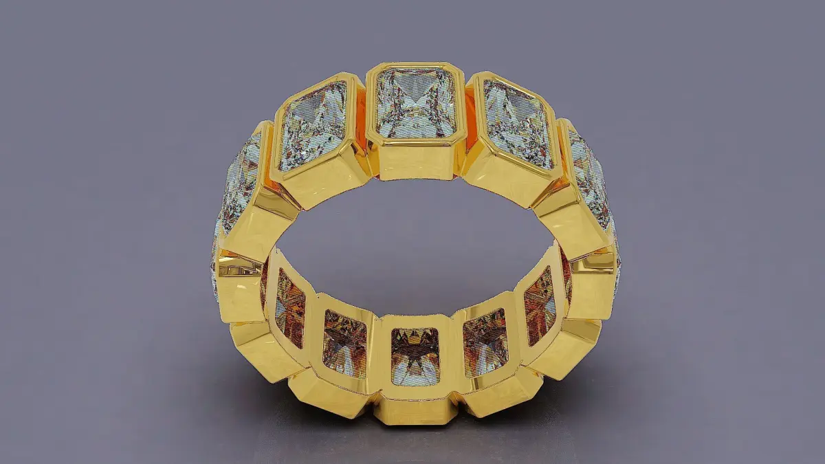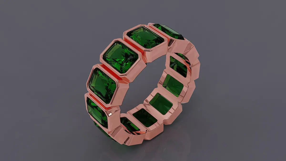 This new, avant-garde bezel-set eternity ring is a stunning fusion of modern design and timeless elegance. Picture twelve radiant cut stones, each meticulously crafted to sparkle with precision, nestled securely within individual square-shaped bezels. The stones are arranged in a seamless circle, creating a bold and structured pattern that feels both contemporary and sophisticated. The gold band, whether yellow, white, or rose, wraps snugly around each stone, ensuring a protective embrace while maintaining a fluid, continuous flow. Together, these elements create a ring that symbolizes unending love and commitment, with its geometric lines and sparkling facets capturing the light from every angle. This design is not just jewelry, it’s a declaration of enduring beauty and refined artistry. Ring rail size is EU (55) with diameter of 17.5 mm. Final weight of ring extracted from Matrix Gold software for all precious metals is shown in the images. Dimensions of radiant cut stones are also exist in pictures. In order to have clearer idea of final product with different materials, several materials such as diamond, emerald, ruby, sapphire, rose gold, white gold, yellow gold were used in rendering process. I invite you to visit other works in my gallery.