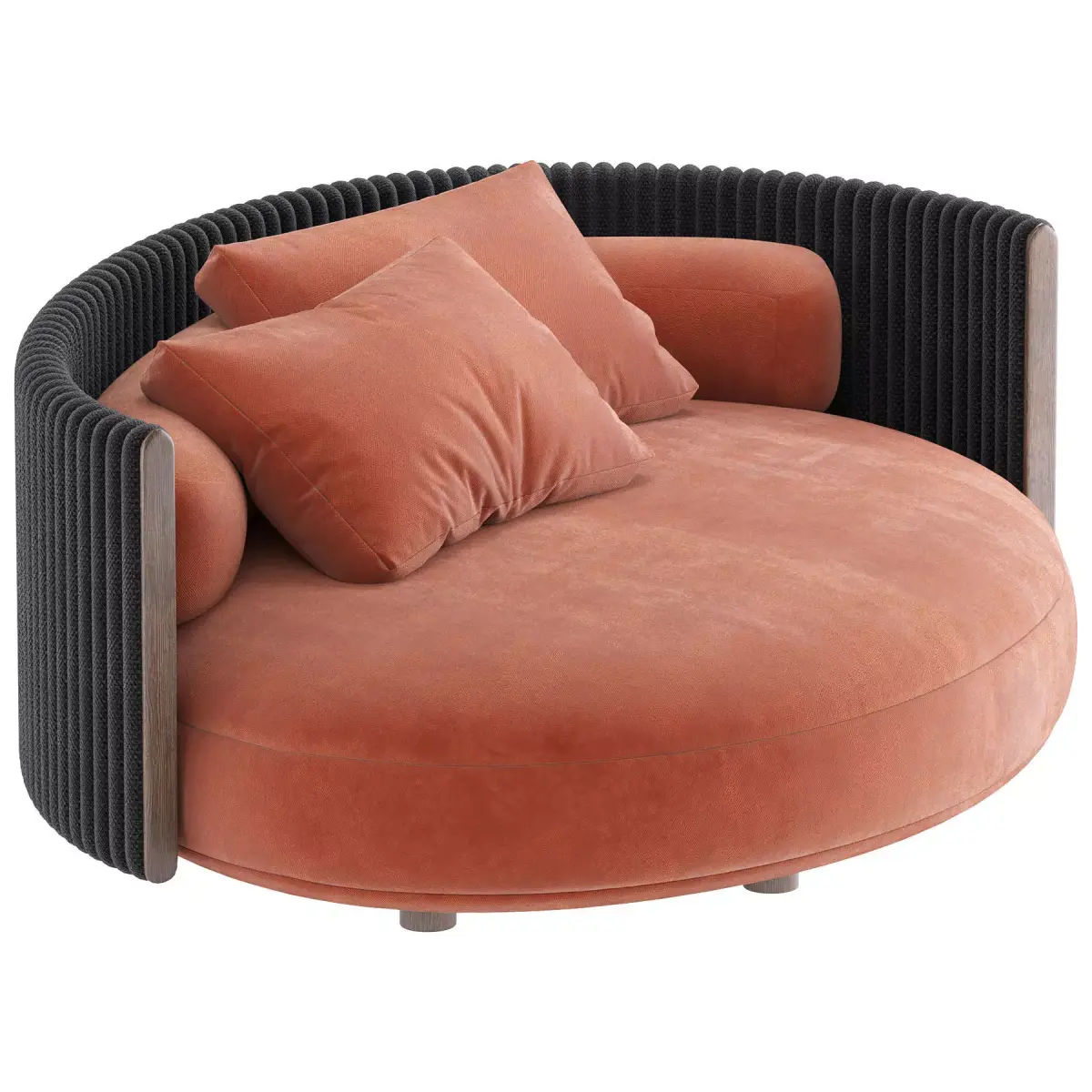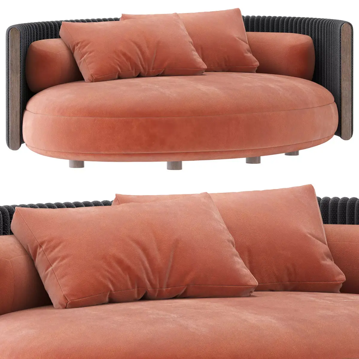 The exceptionally comfortable one-piece seat is defined by its softness, achieved as a result of the careful layering of high-density polyurethane foams with varying thicknesses, ensuring uniform comfort across the entire surface. Given the organic shapes, the tailoring of the stitching is extremely precise, meticulously following the curves of each element. The deep and generous seat is elevated off the ground thanks to the recessed stainless steel feet in dark brown, making Bézier Cord Outdoor ideal for both formal settings and moments of pure relaxation.