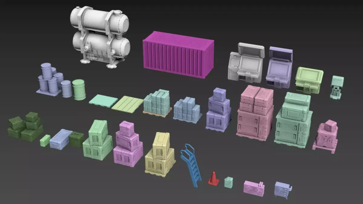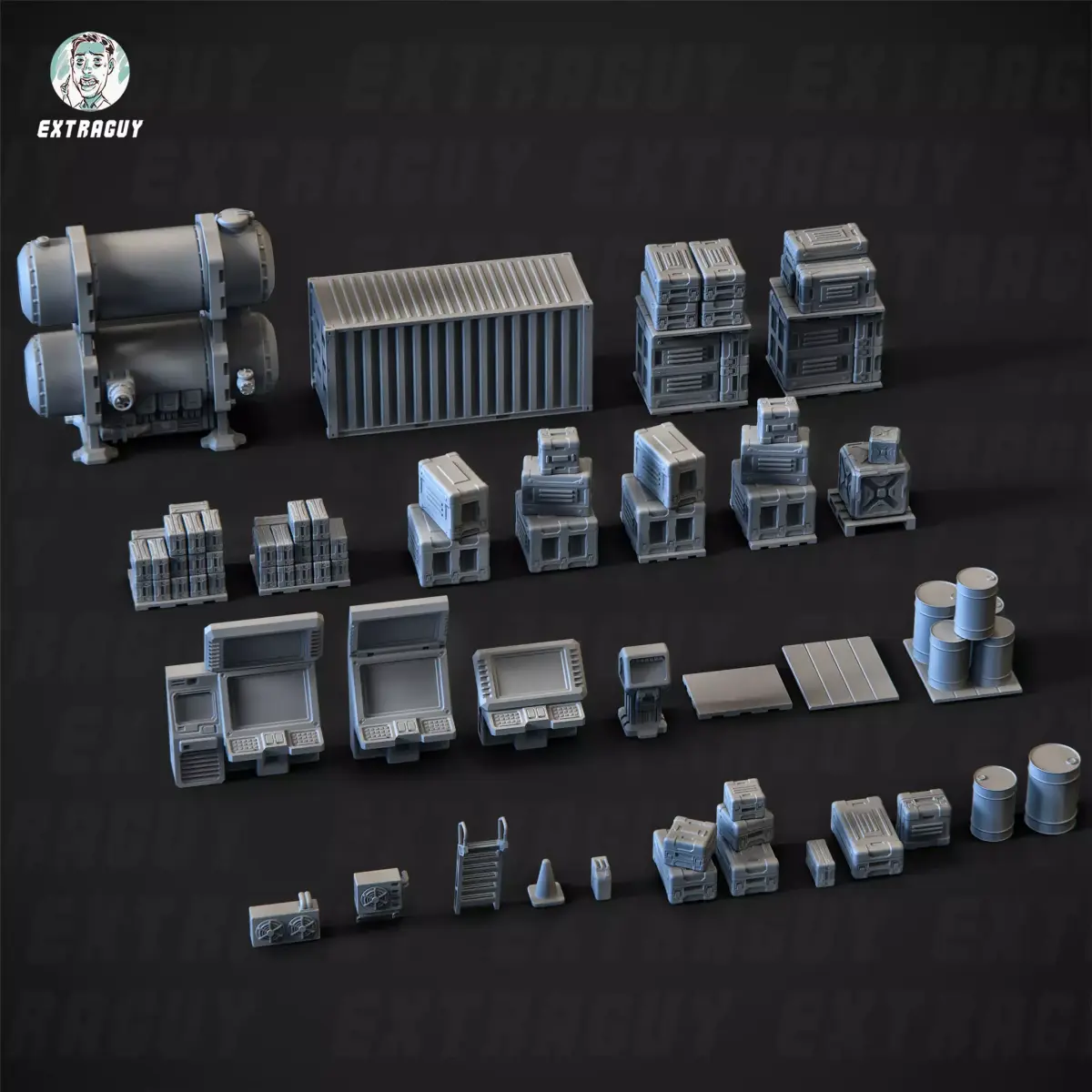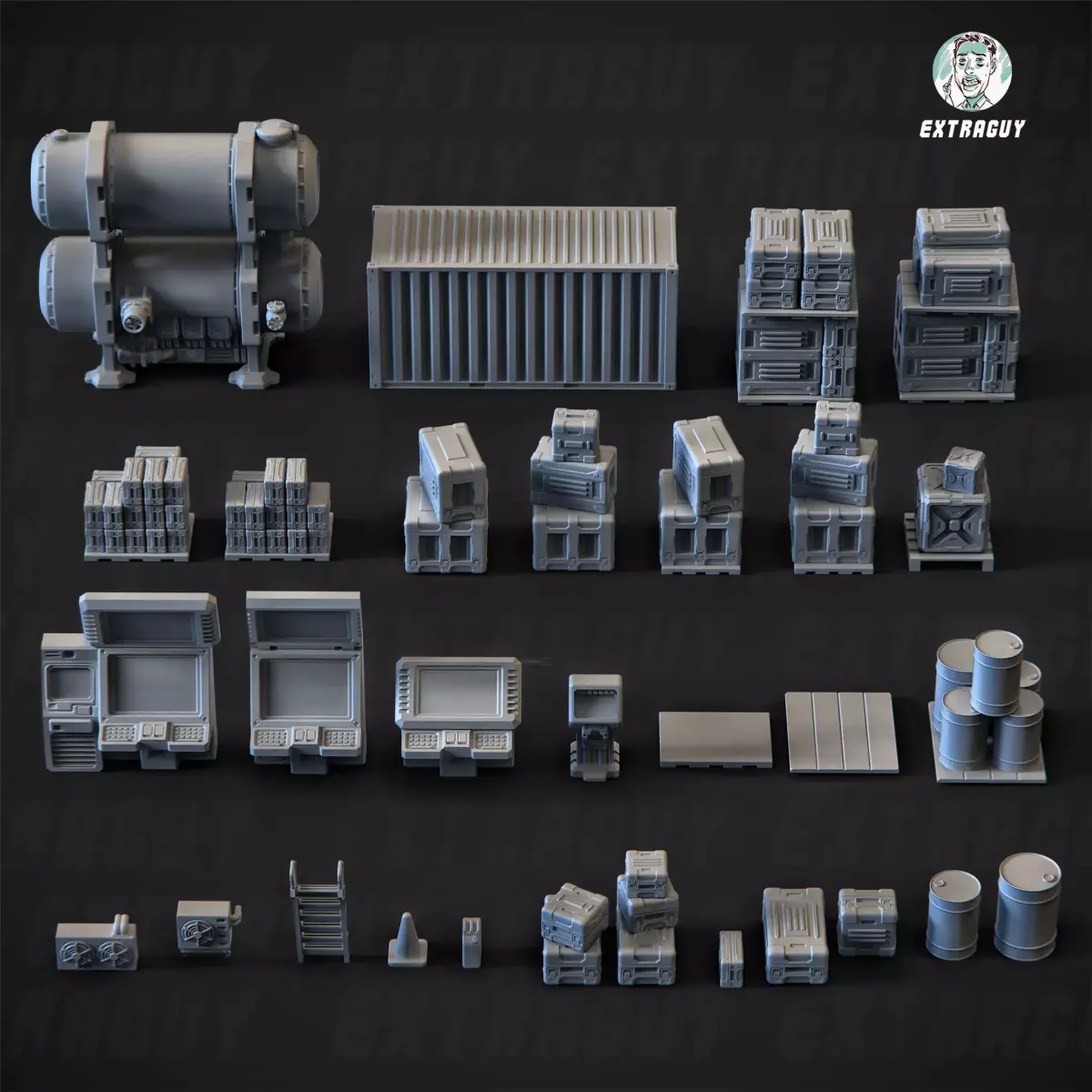 Ola, I present you Robotech Base PropsA total of 30 prop assetsto populate the Base DioramaAssets consist ofAC (2 versions)barrels (on pallet and stand alone)Boxes, crates (on pallet and stand alone)coneConsoles (various configuration)container vanpallet (2 version)fuel depotladderPetrol can