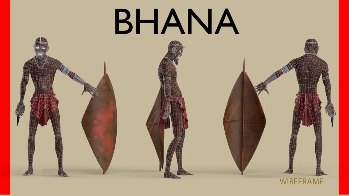 NB: Bhana's loin cloth is unrigged and meant to be simulated after animation using Maya, Blender or Marvellous designer.