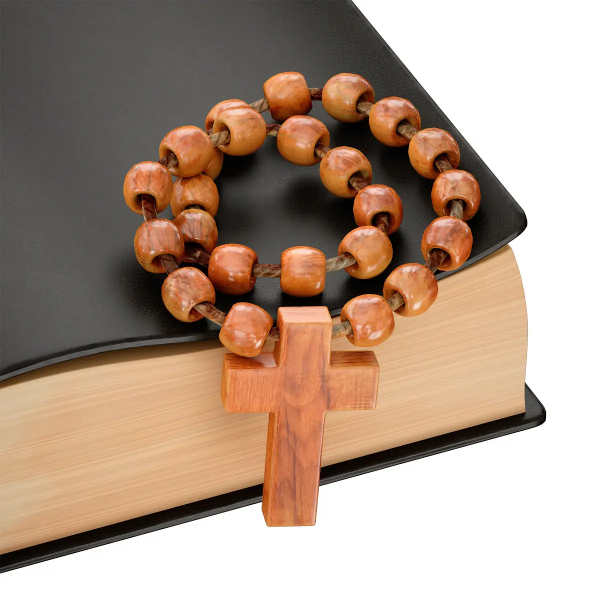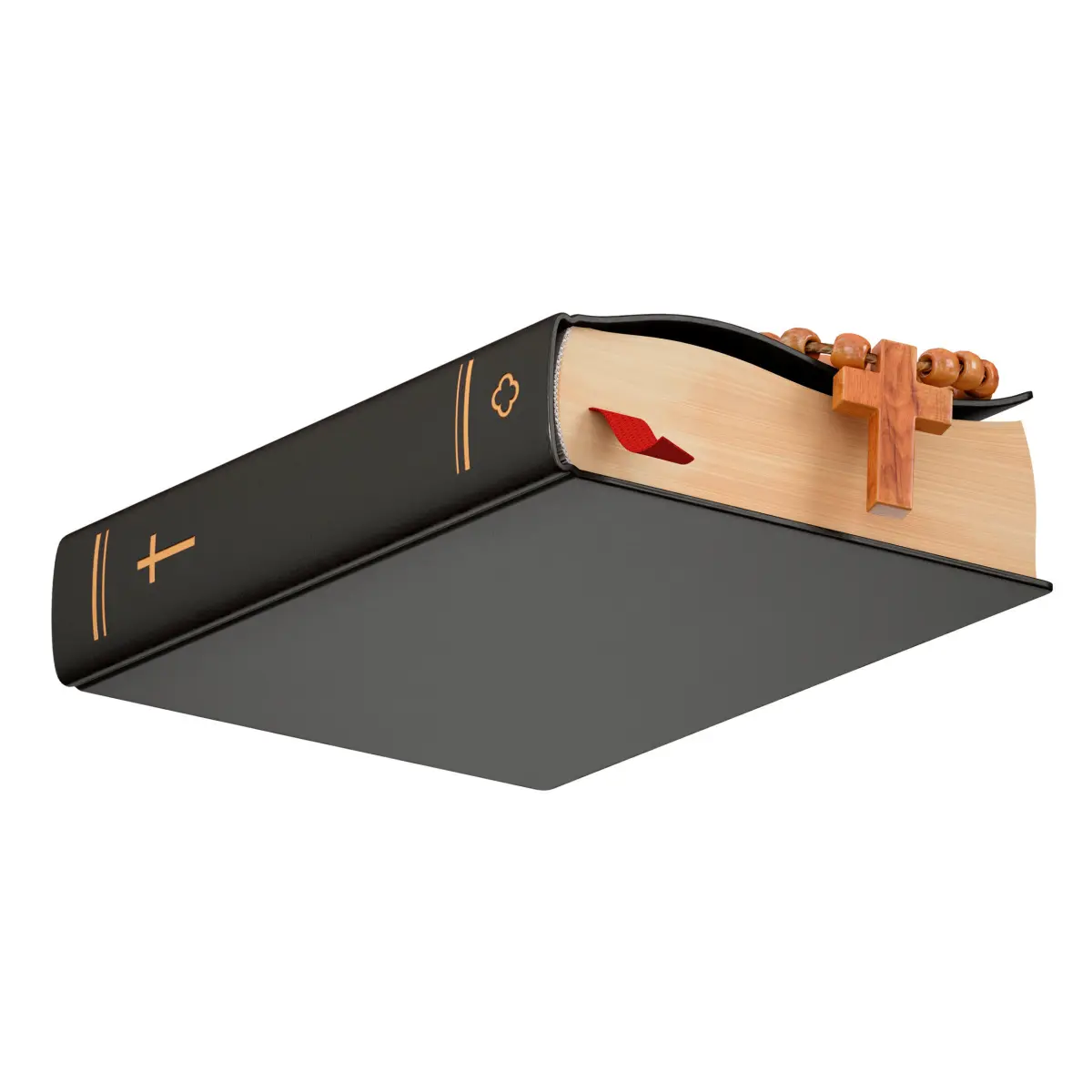3d model of the Bible. The book is bound in black leather with a red cloth bookmark. The cover depicts a gold-embossed cross. A rosary made of light wood with a wooden cross was added as an additional decoration.