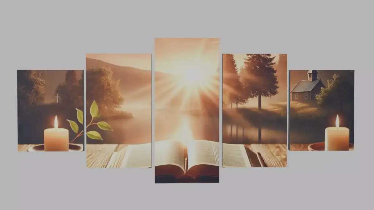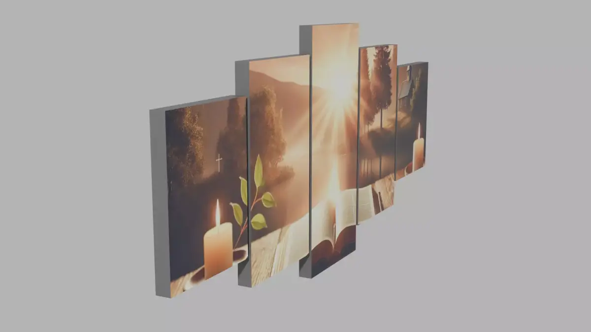 This inspirational wall art piece, titled “Bible in the Sun,” captures a warm and peaceful moment of reflection. A Bible rests on a wooden dock as the setting sun casts golden light across the water, while a small church stands quietly in the distance beneath a glowing sky. The soft tones and balanced composition evoke themes of faith, hope, and serenity. The artwork is divided into five vertically graduated panels, with the tallest at the center, creating a dramatic focal point that enhances its depth and presence. Perfect for living rooms, studies, or places of worship, this piece brings a comforting spiritual atmosphere to any space.