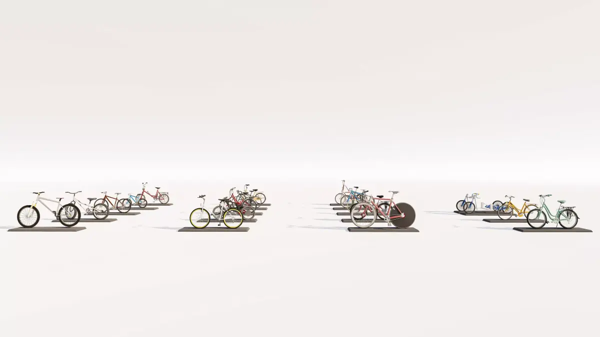 This is an essential 3D asset pack featuring a collection of four distinct, high-quality modern bicycles, perfectly suited for populating architectural visualization (Arch-Viz) projects, urban scenes, park environments, and streetscapes. Each model is characterized by clean geometry and realistic detailing.