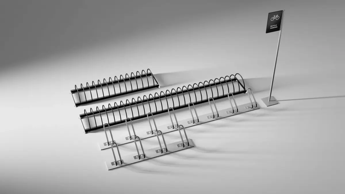 2 kinds of equipment for bicycle parking with 2 variations of each one + a sign for that (no bicycles in the set).