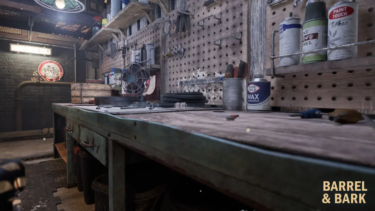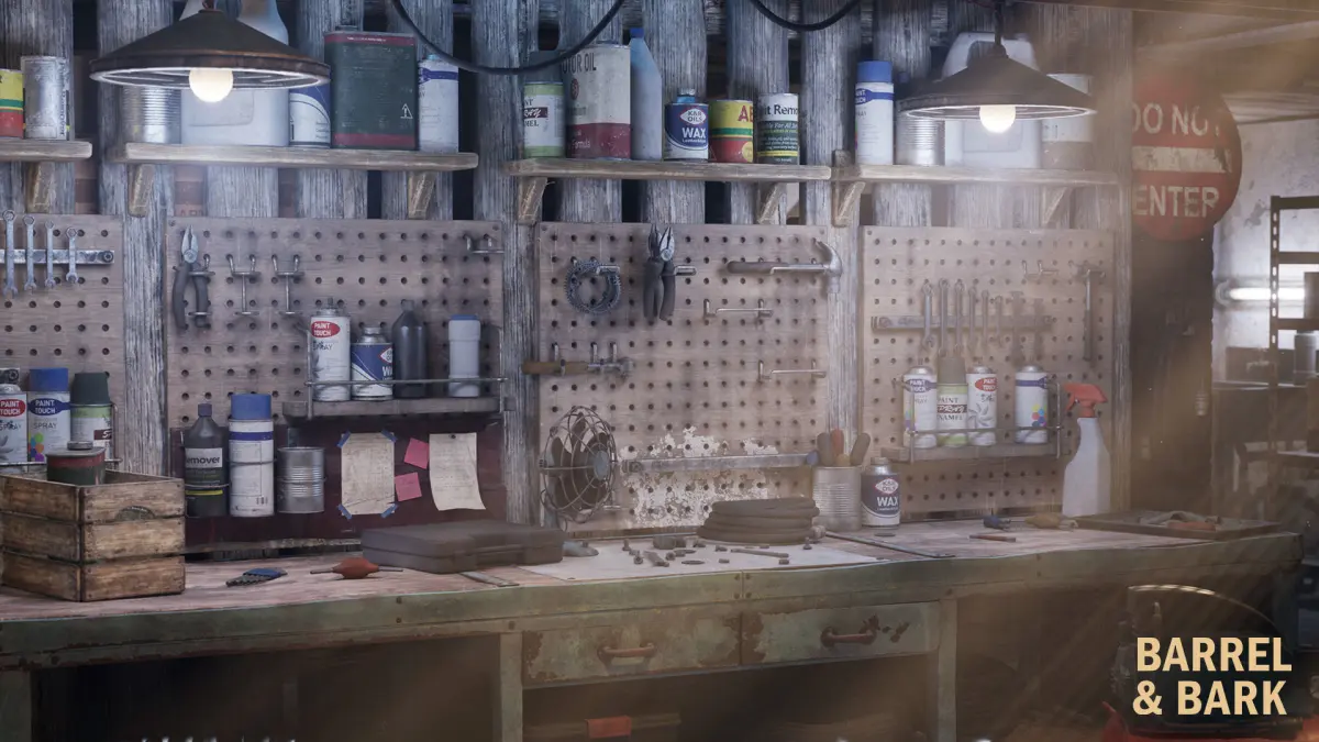 - Storage racks, workbenches, and clutter for that lived-in feel