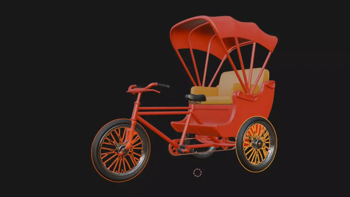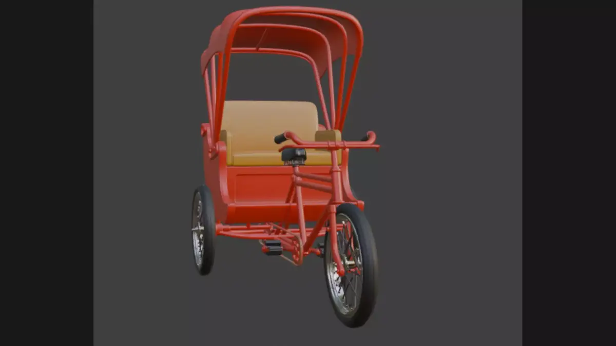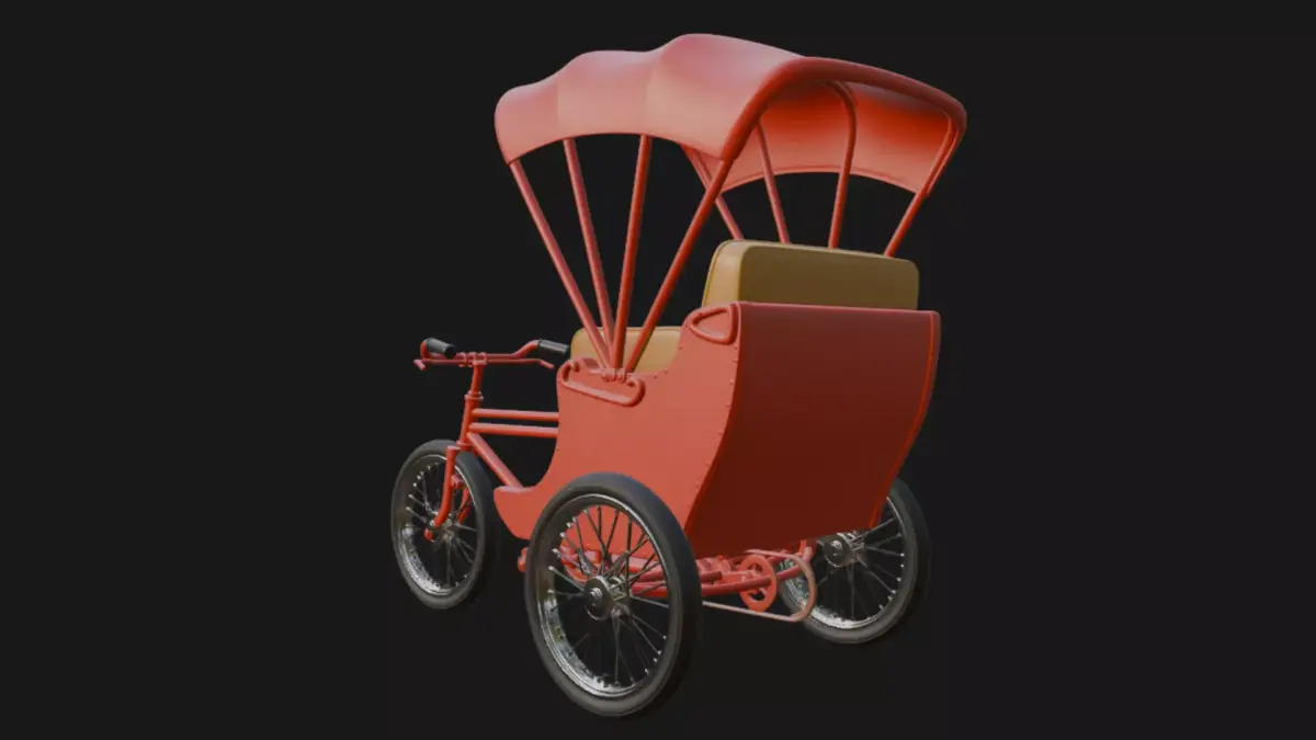A meticulously crafted 3D model of a classic bicycle rickshaw featuring chrome-trimmed steel frame, plush crimson leather seats, folding scarlet canopy, and polished spoked wheels. Perfect for historical street scenes, Asian city dioramas, or retro transport animations. High-poly detail with clean topology, UV-unwrapped and ready for texturing.