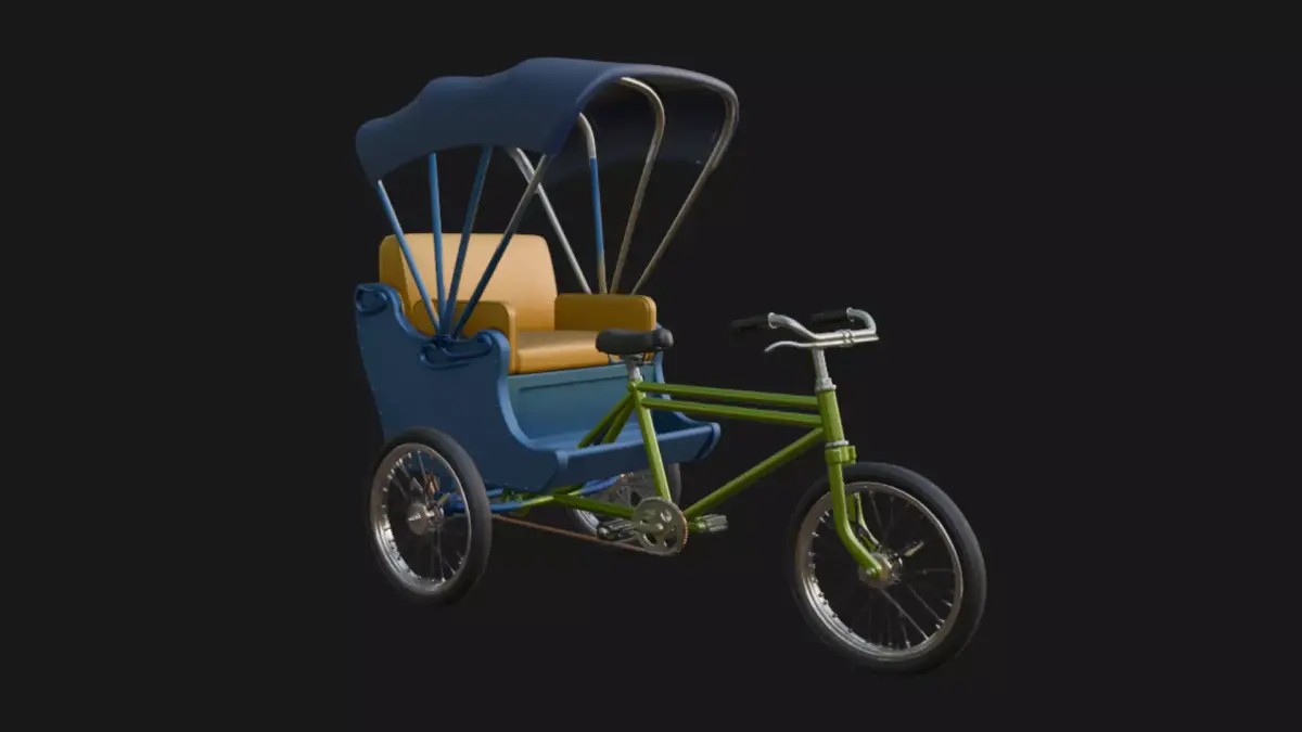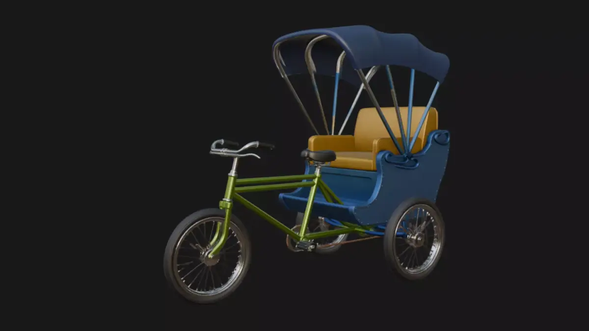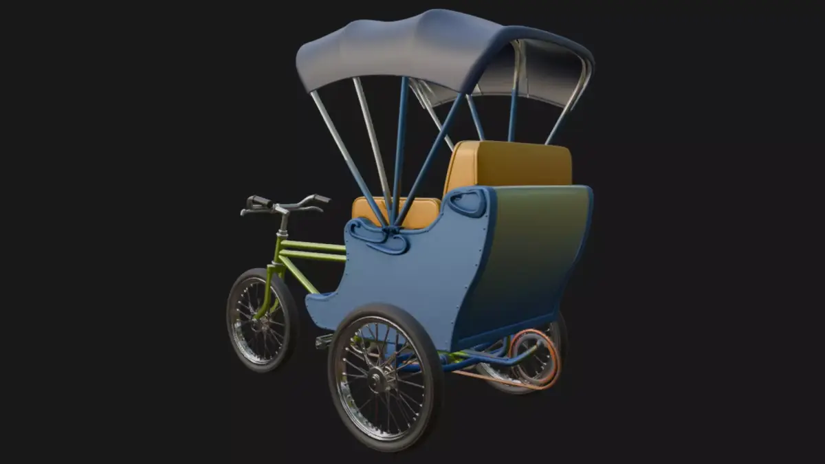 A meticulously crafted 3D model of a classic bicycle rickshaw featuring chrome-trimmed steel frame, plush crimson leather seats, folding scarlet canopy, and polished spoked wheels. Perfect for historical street scenes, Asian city dioramas, or retro transport animations. High-poly detail with clean topology, UV-unwrapped and ready for texturing.