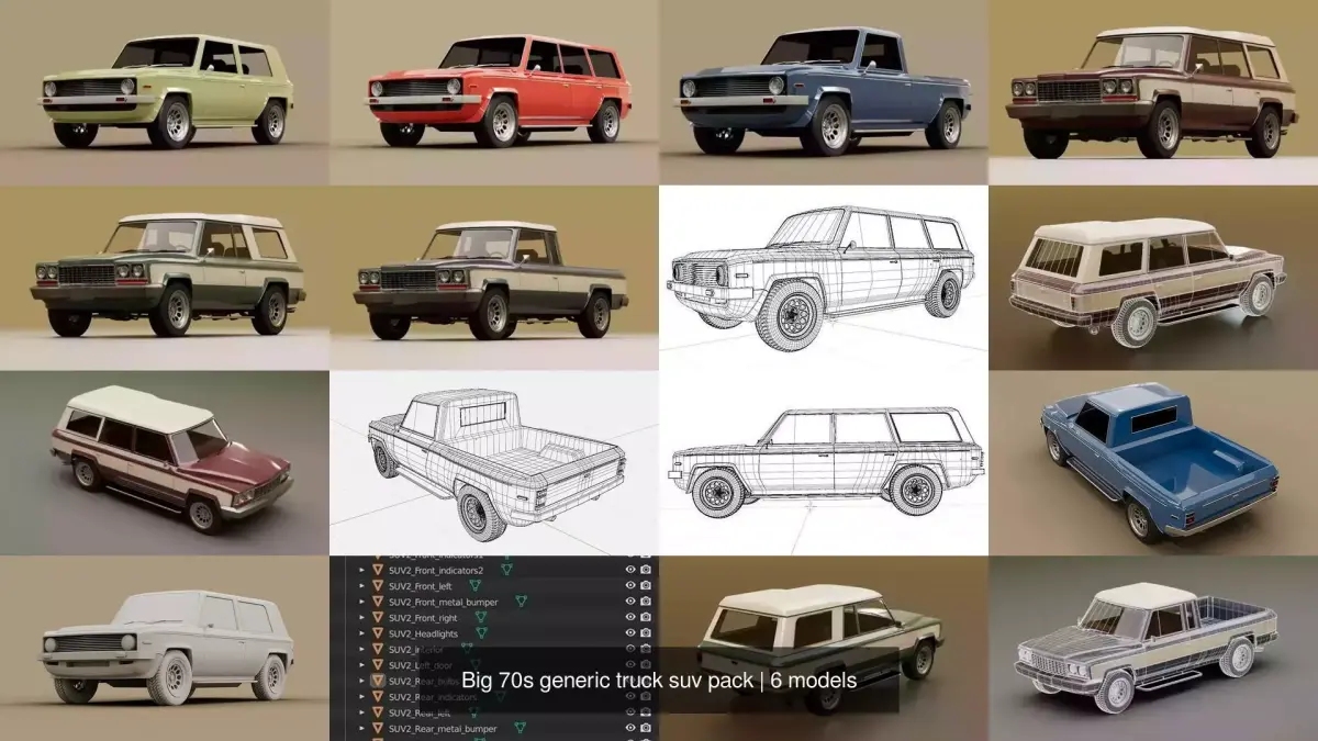 About pack: Pack contains 70s style generic SUV's/Pick-up trucks. The task was to create models that will be used as a game assets or to fill the backgrounds of the scenes. Design of the models were inspired by 70s muscle cars and american cars.