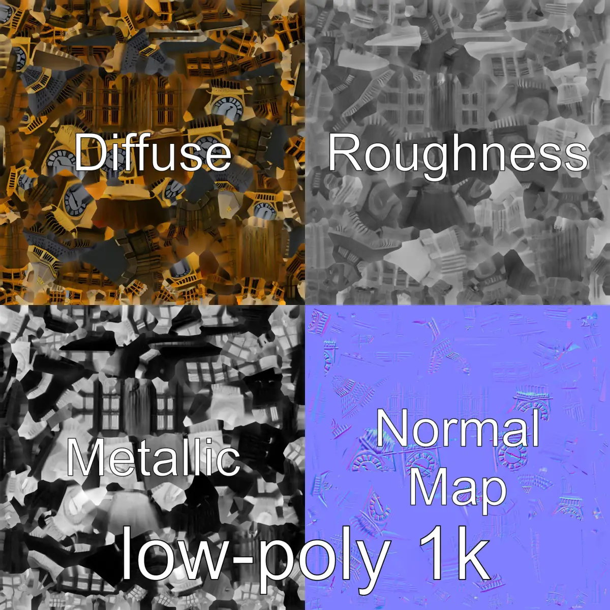 This Big Ben Clock Tower model includes low-poly, middle-poly, and high-poly levels, perfect for production rendering (such as 3ds Max, Maya, Cinema4d, Blender, Vray/Corona/Cycles), game engines (Unity and Unreal compatible), and interactive presentations using the LOD System principle for detail selection. Ideal for architectural visualizations, virtual reality tours, and educational simulations. Features PBR, Diffuse, NormalMap, and reflection/roughness/metallic textures suitable for any modern rendering engine. Accurately unwrapped with no overlapping UVs. All textures are 4096*4096 in size. If you like it, please leave a comment and give a like.