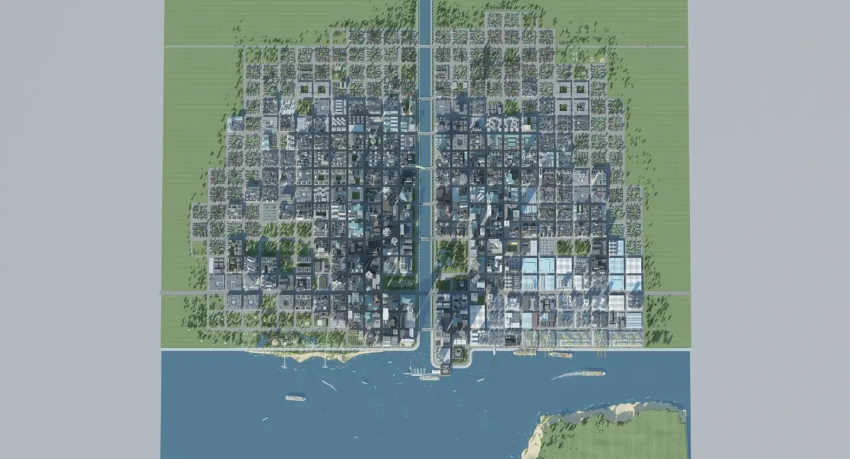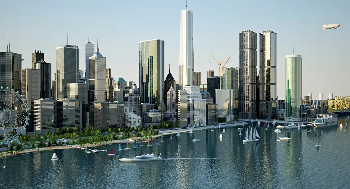 Impressive skyline, inspired by the most popular cities like New York or Chicago, or other big cities around the world. With central parks, sea side, canal, large streets, high density office buildings, bridges, park ponds and alleys, etc.