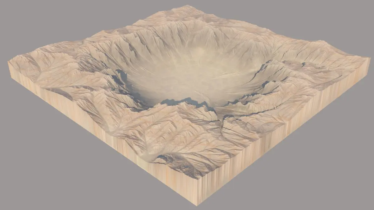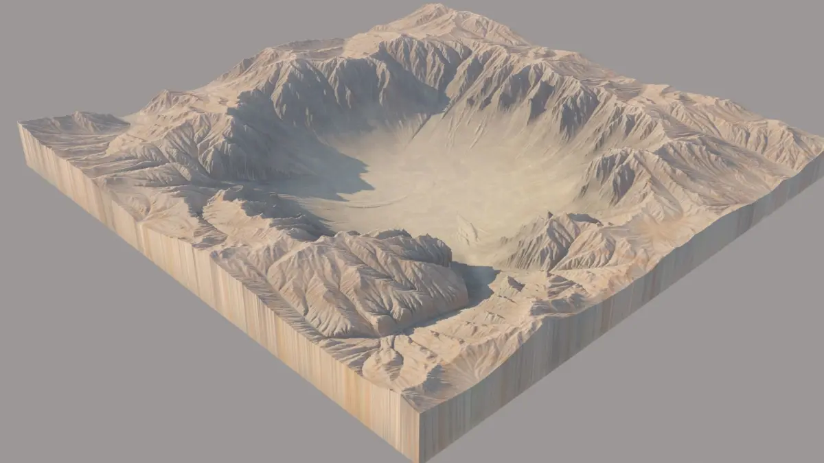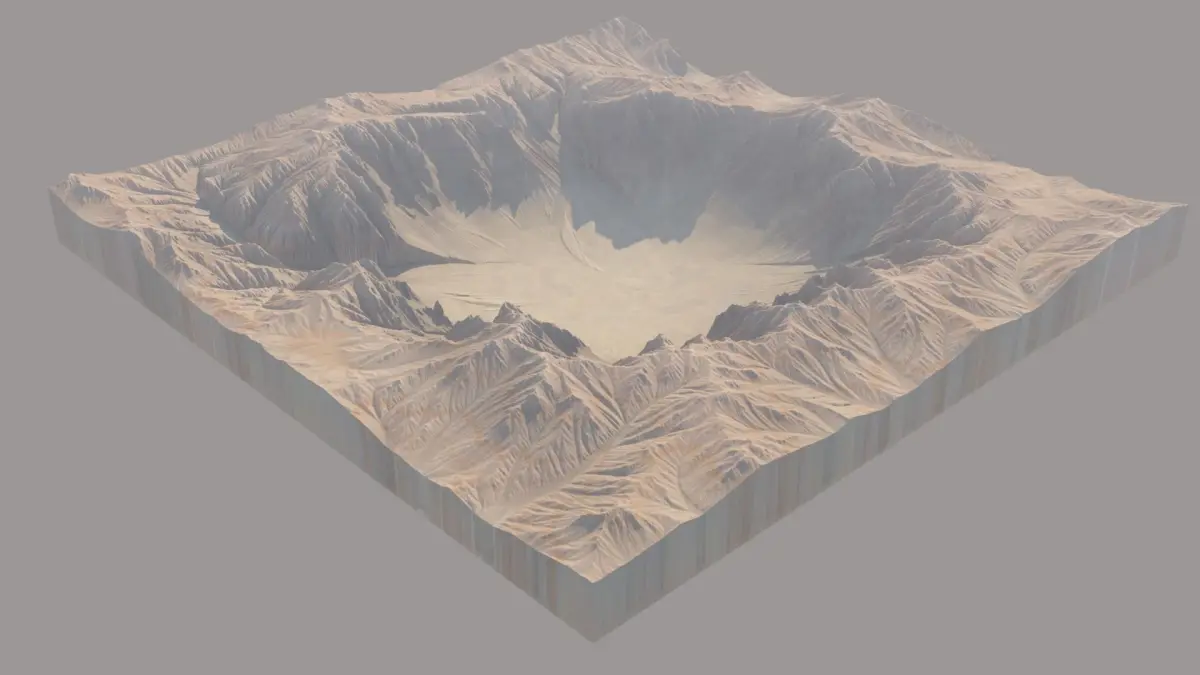 A huge crater, with mountains mountains. There is a high and a low version of the model in FBX and OBJ format and a 3d max file for you to play with.