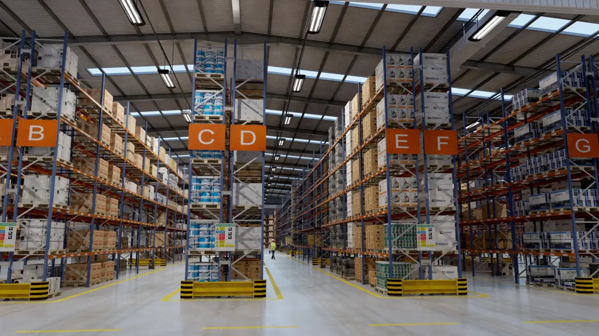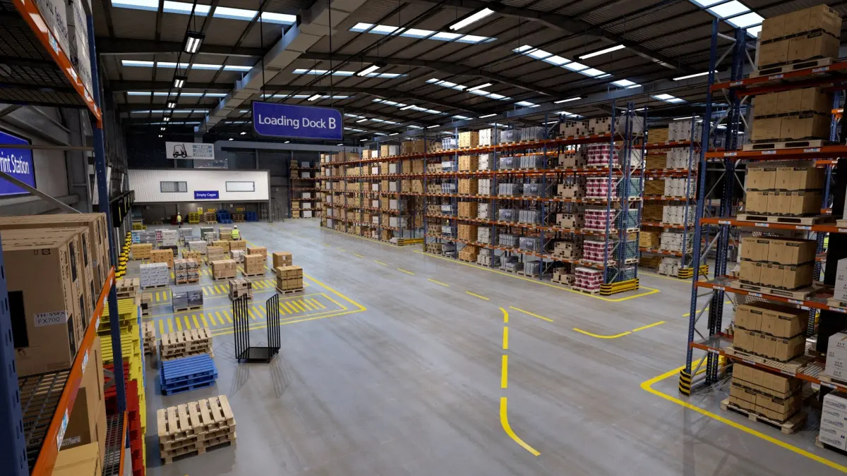-Real world scale, physical warehouse size ~112m X 76m X 12m.