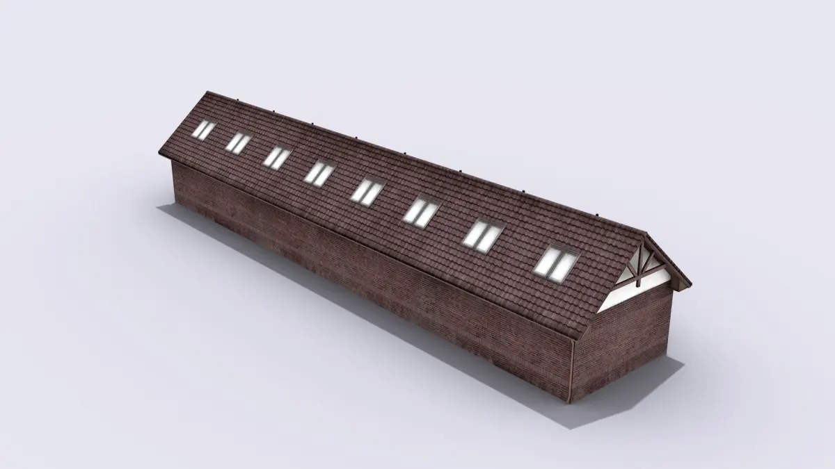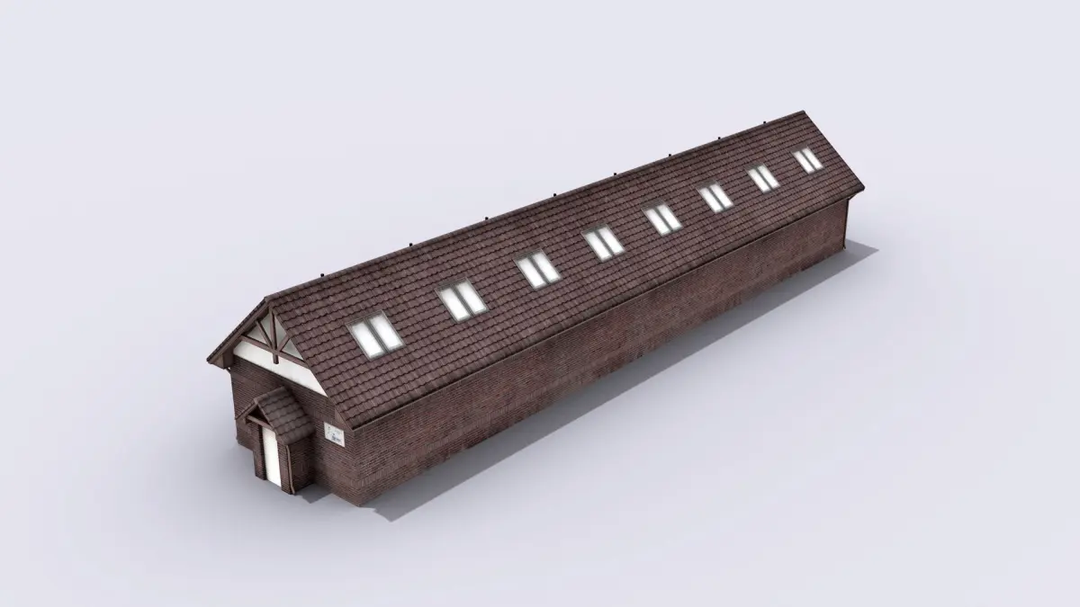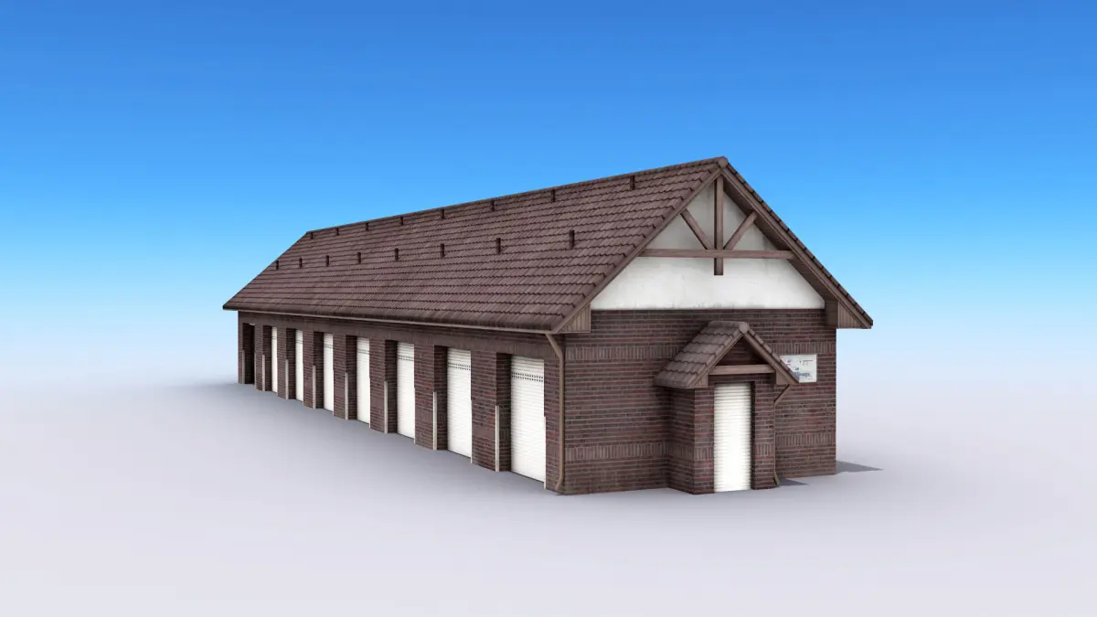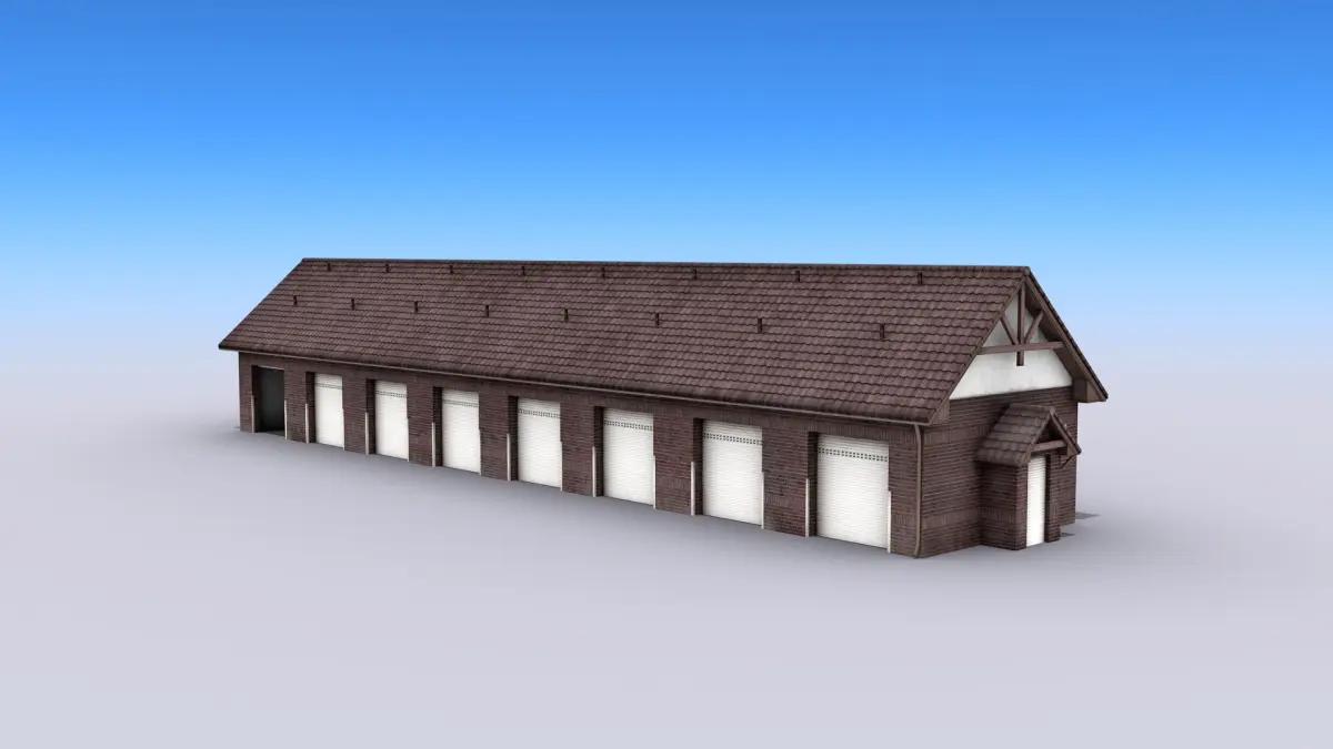 High-quality low-poly 3D model of Brown Warehouse With Garage Places.
